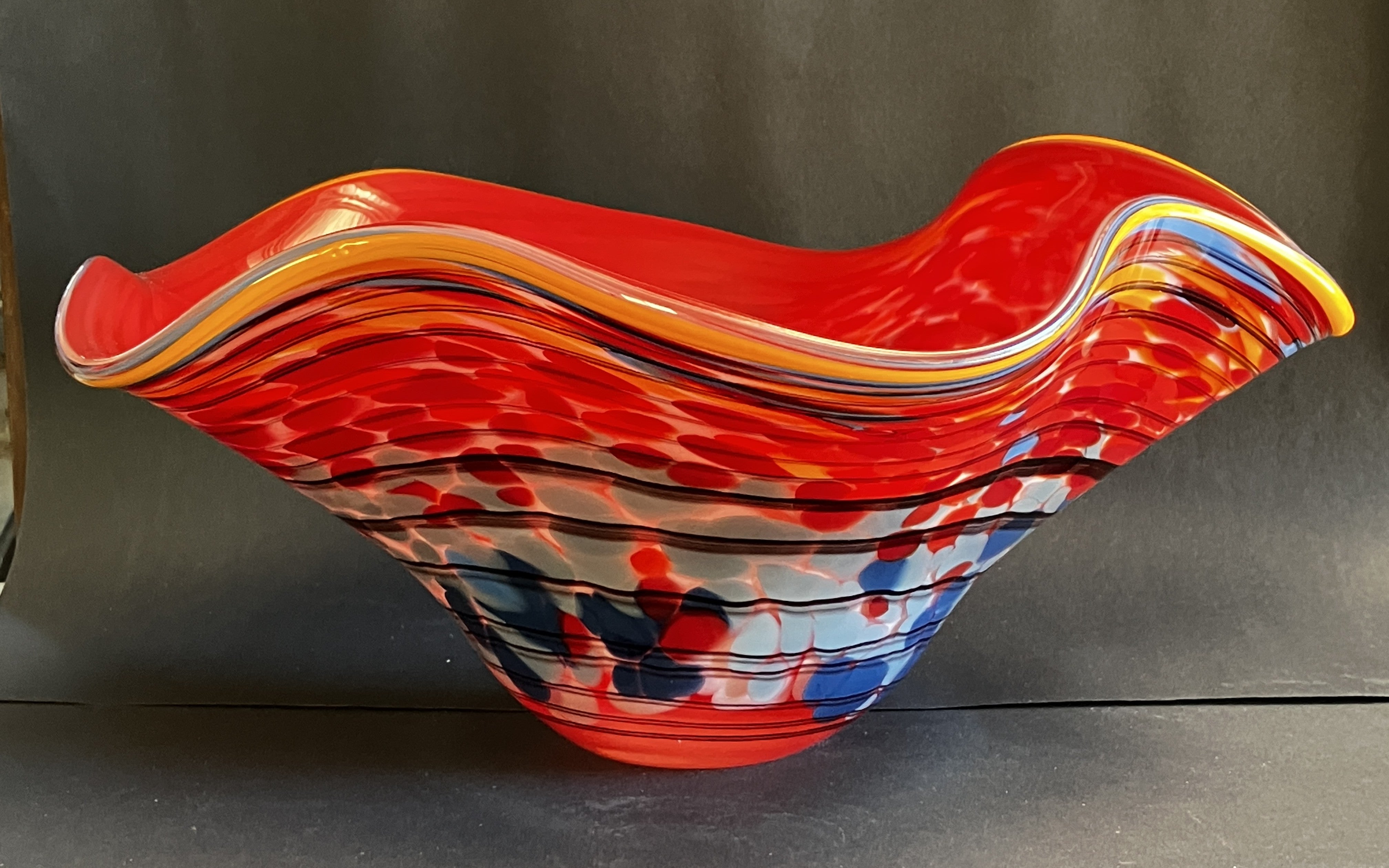 Large Fluted Red Bowl with Blue Chips, Black Threading and Yellow Lip Wrap.