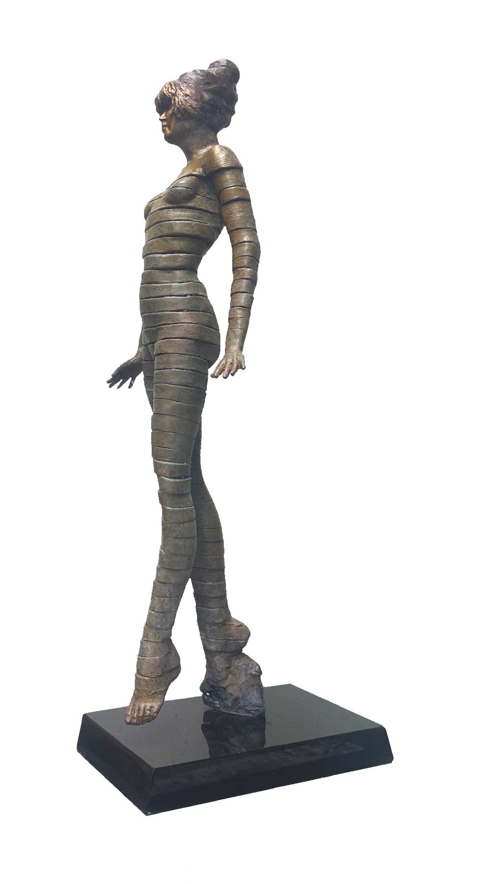 Yet like a magician compelled to reveal his tricks, Glassborow often deconstructs the process of creation. The figures are sometimes revealed in their unformed or half-formed states. For example, ‘point’ moves from an aesthetic that recalls the raw clay of the early modelling process, through a roughly finished and patinated green bronze, to the lush gold of the polished metal. The figure incorporates both naturalistic and mechanistic elements, creating a poetic juxtaposition between the material of antiquity and the imagery of the age of automaton. Find the full introduction here.