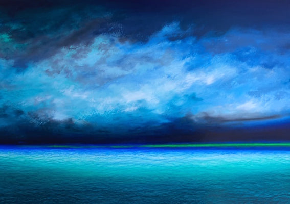The hyper-romantic imagery is another striking feature of this unusually cohesive body of work. Bushfires or volcanic eruptions burst over cool oceans, islands seem to float over the horizon, portals of light open up a vertical passage between ocean and sky. Many of the images speak to a moment of transformation: fire, storm, the giant orb of a full moon blooming in the sky. There is a sense that something is about to change, some truth is about to be revealed, a final destination reached. It is possible to read them as drawing a parallel between physical landscapes and the dream-like landscapes of the mind. With their focus on the meeting of opposites- fire and water, earth and air- they speak to alchemical processes and psychic transformation. They evoke a sense of a something that is unknown yet familiar, an impossible dream that is still deeply felt to be real. Find the full introduction here.
