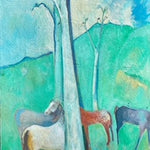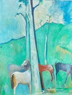 Robbie enjoys a certain freedom as a painter. He is engrossed by landscapes, and not surprisingly, they form the foundation of most of his paintings. Horses in fields grazing, grouped, and resting, provides a sense of humanity within Robbie’s paintings. It allows the viewer to identify with the painting subjects and relate them back to daily human behaviours. These subjects are at ease within rolling pastures and sweeping, distant mountain ranges.