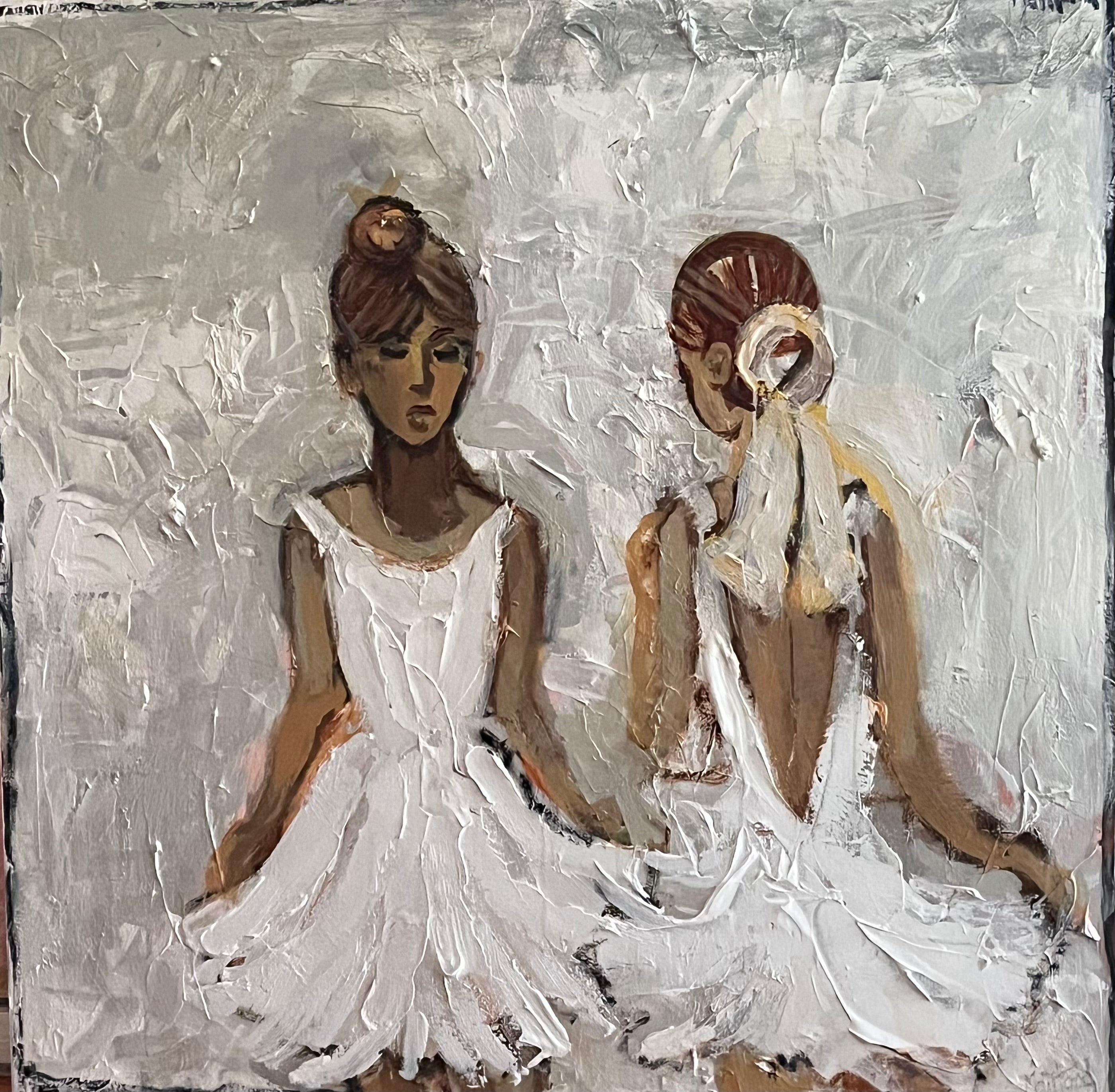 Artist Statement: Just finished! Literally before the (the painting) performance in Cooks Hill Gallery.... a work to capture the beauty of these ballerinas who exude such elegance..... The 'Parisian influence'. I've used thick impasto laid on with a knife to create not only texture but softness as well.- John Maitland.