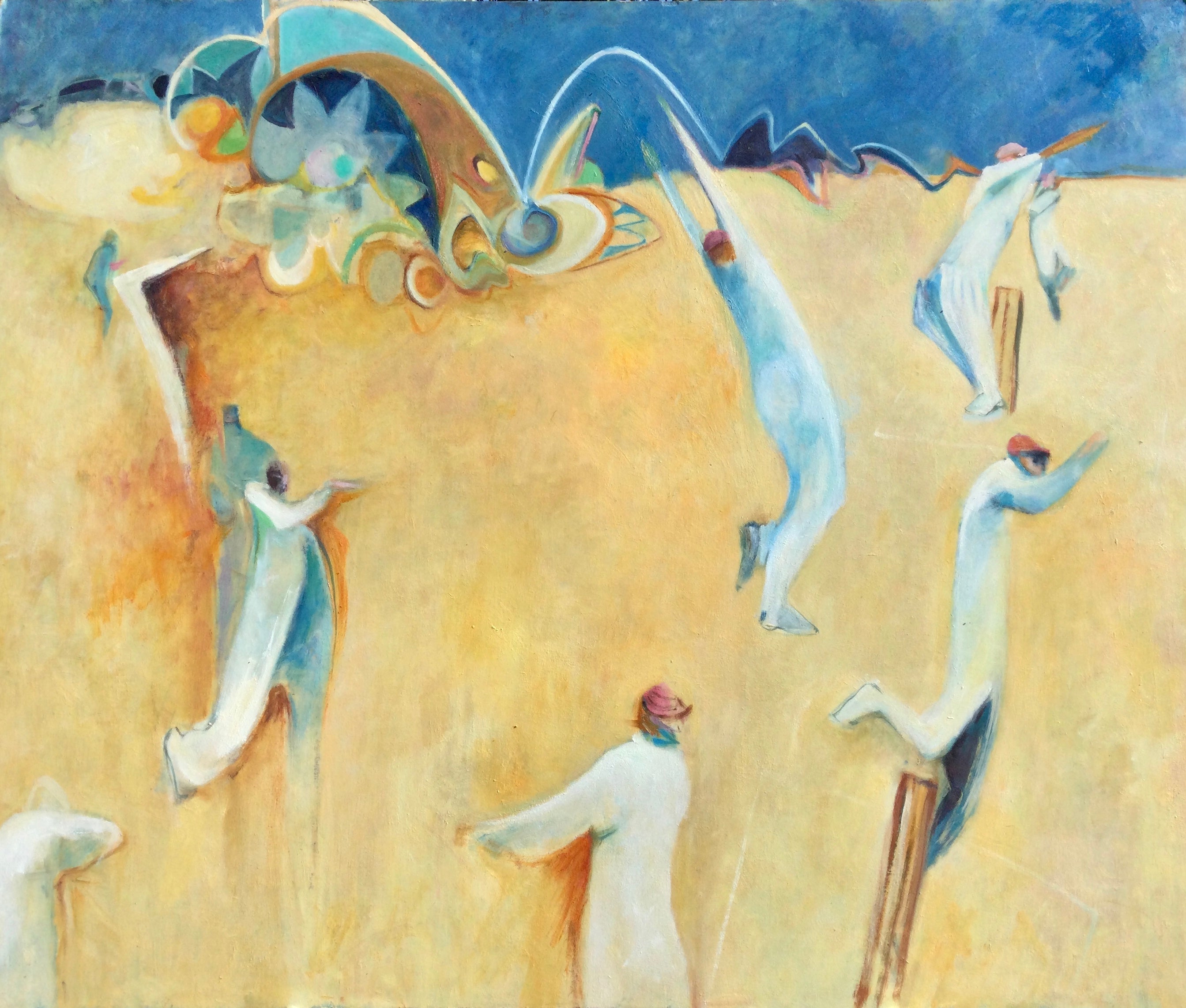 Contrasting his landscapes is Robbie’s work that exposes rural cricket teams, battling it out on parched pitches. The players often appear stylised, but are still convincing, as their painted forms capture the pose and movement of active players and matches.