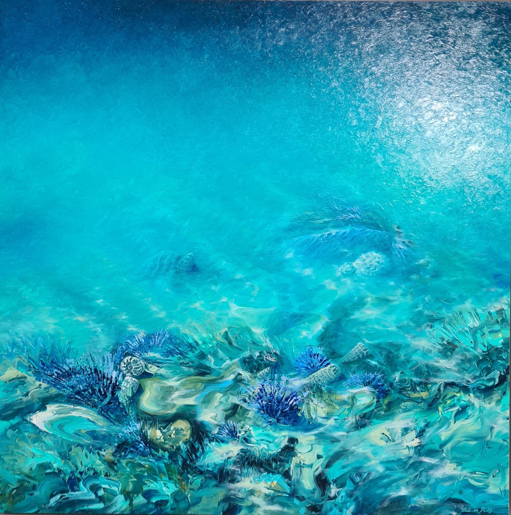 Artist Statement: This painting is part of a series of paintings that are inspired by my first diving experience on The Great Barrier Reef. Lots of colour and lots of sounds in the shallow water where the sunlight and ocean create that beautiful teal green colour.