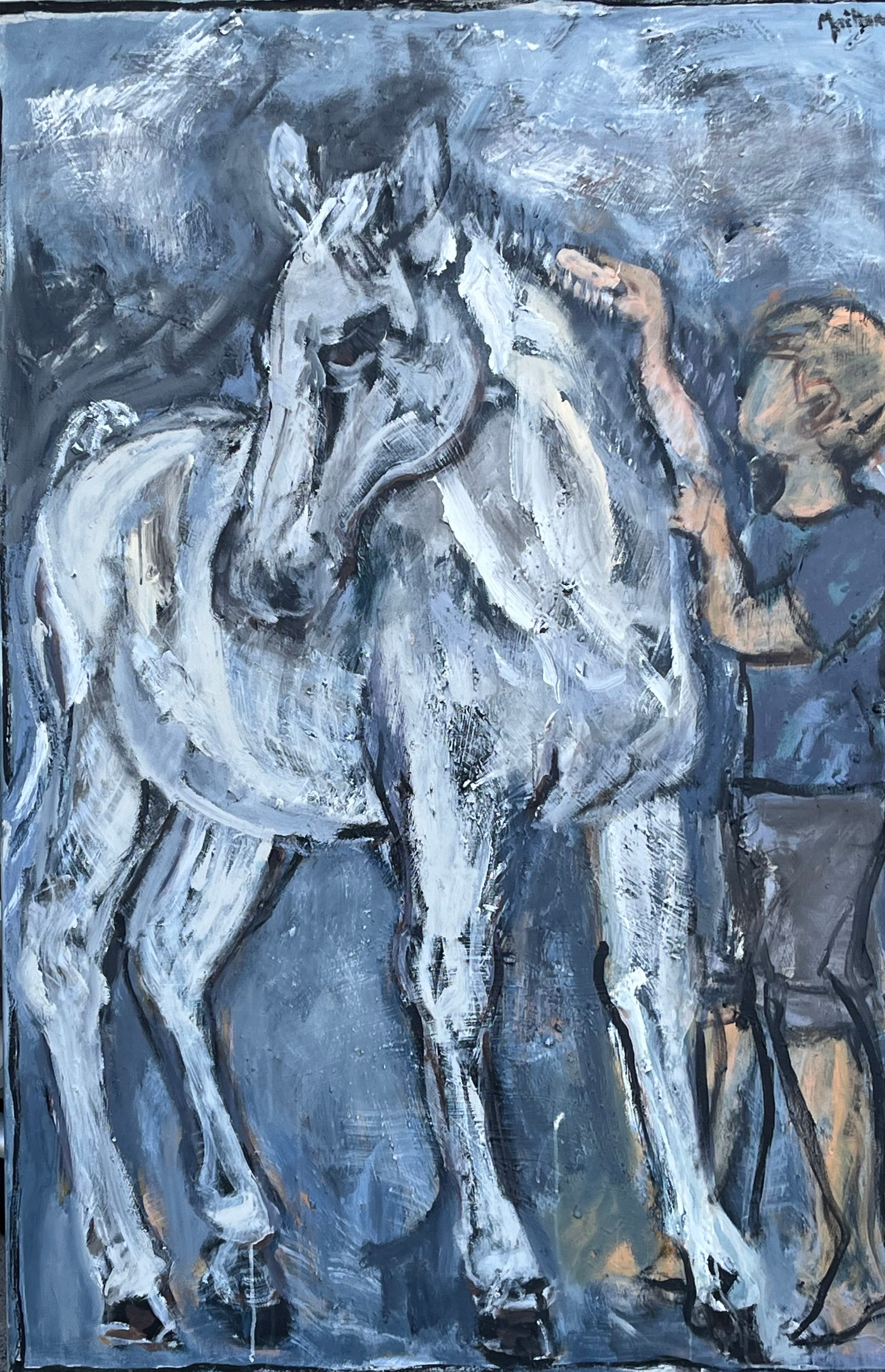 Artist Statement: "My wife and I left Northern island behind on a cold wet morning heading for Limerick in January. The scenery.... spectacular green hills, mountains, sun rays poking through clouds illuminating vistas. Then coming into a small village white cottages, dry stone and walls and a boy grooming his horse at the side of the road...... immediate inspiration".- John Maitland.