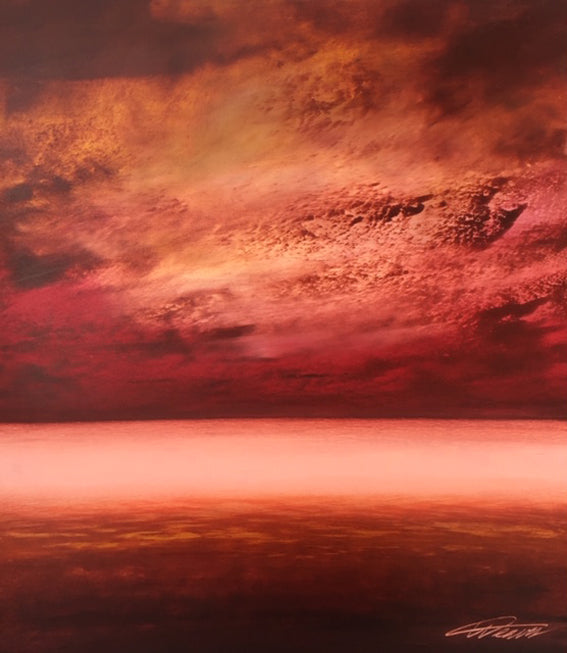 The hyper-romantic imagery is another striking feature of this unusually cohesive body of work. Bushfires or volcanic eruptions burst over cool oceans, islands seem to float over the horizon, portals of light open up a vertical passage between ocean and sky. Many of the images speak to a moment of transformation: fire, storm, the giant orb of a full moon blooming in the sky. There is a sense that something is about to change, some truth is about to be revealed, a final destination reached. It is possible to read them as drawing a parallel between physical landscapes and the dream-like landscapes of the mind. With their focus on the meeting of opposites- fire and water, earth and air- they speak to alchemical processes and psychic transformation. They evoke a sense of a something that is unknown yet familiar, an impossible dream that is still deeply felt to be real. Find the full introduction here.