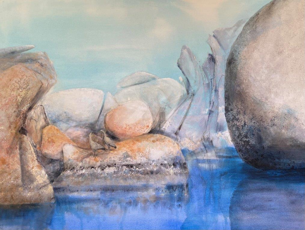 Artists Comment: "We anchored in a bay surrounded by these huge majestic boulders. I've never seen or been in a landscape like it - an artist's and photographer's paradise! These boulders towered over us and many were so smoothly rounded. Pairs of Cape Barren Geese grazed among them .The water was so blue, deeper than the sky, orange lichen grew on many of them and below to the high water mark was rich with texture.