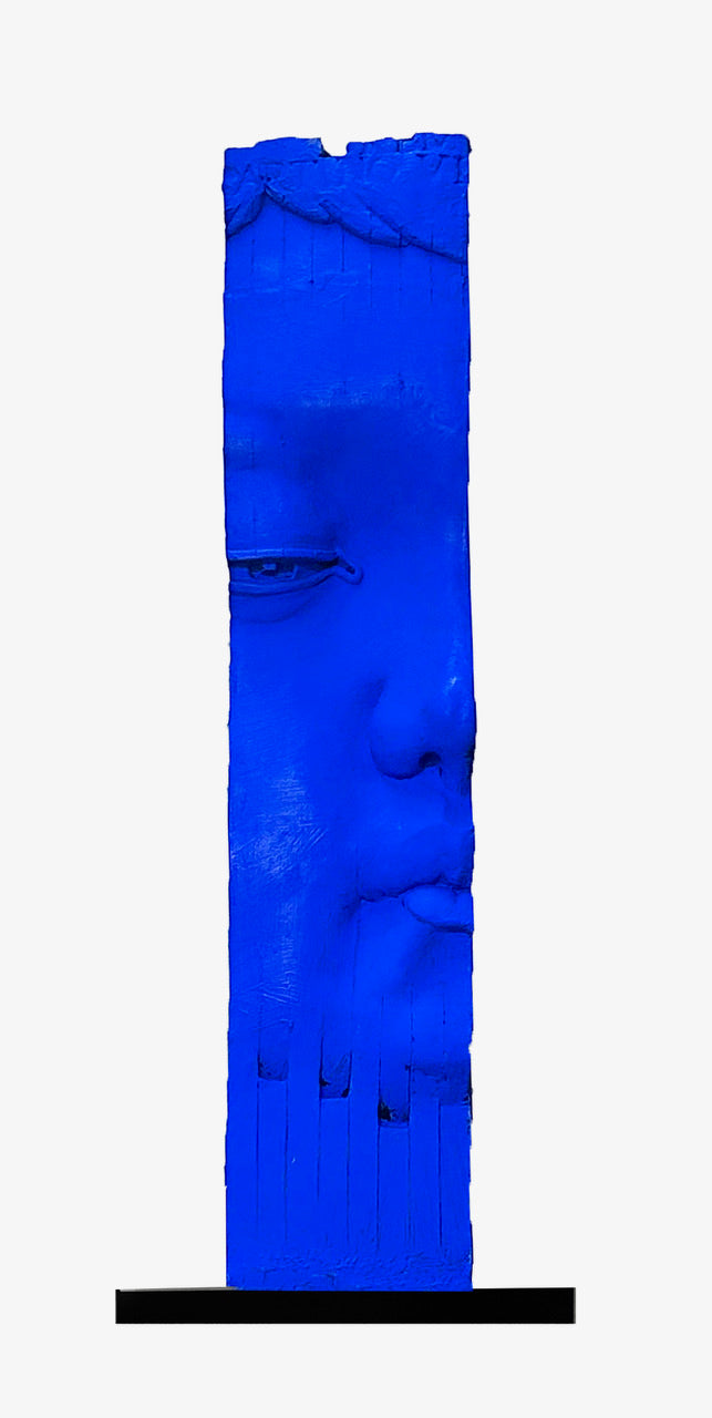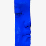 Its softened features recall classical ideals yet stand alone in Yves Klein blue.