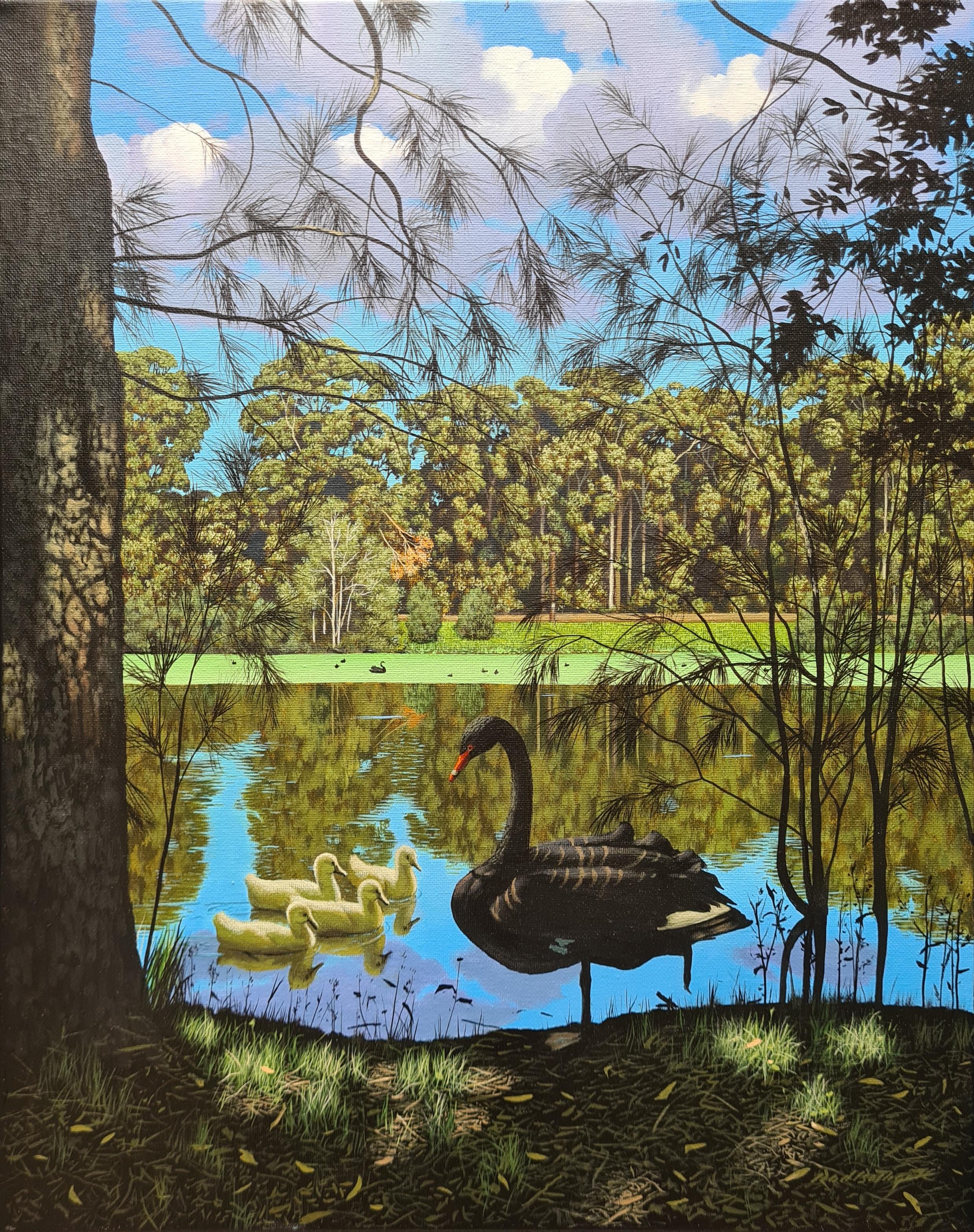 Artist Statement: Mother swan and cygnets. (This is a larger version of the one on the wood panel but on canvas). - Rod Bathgate