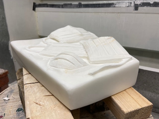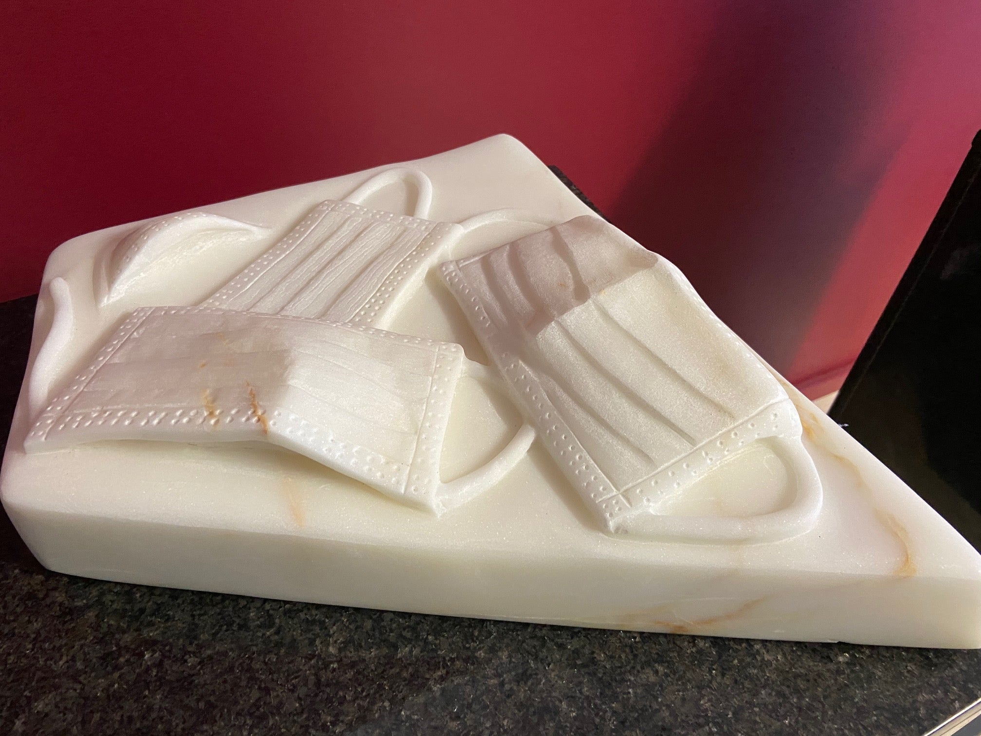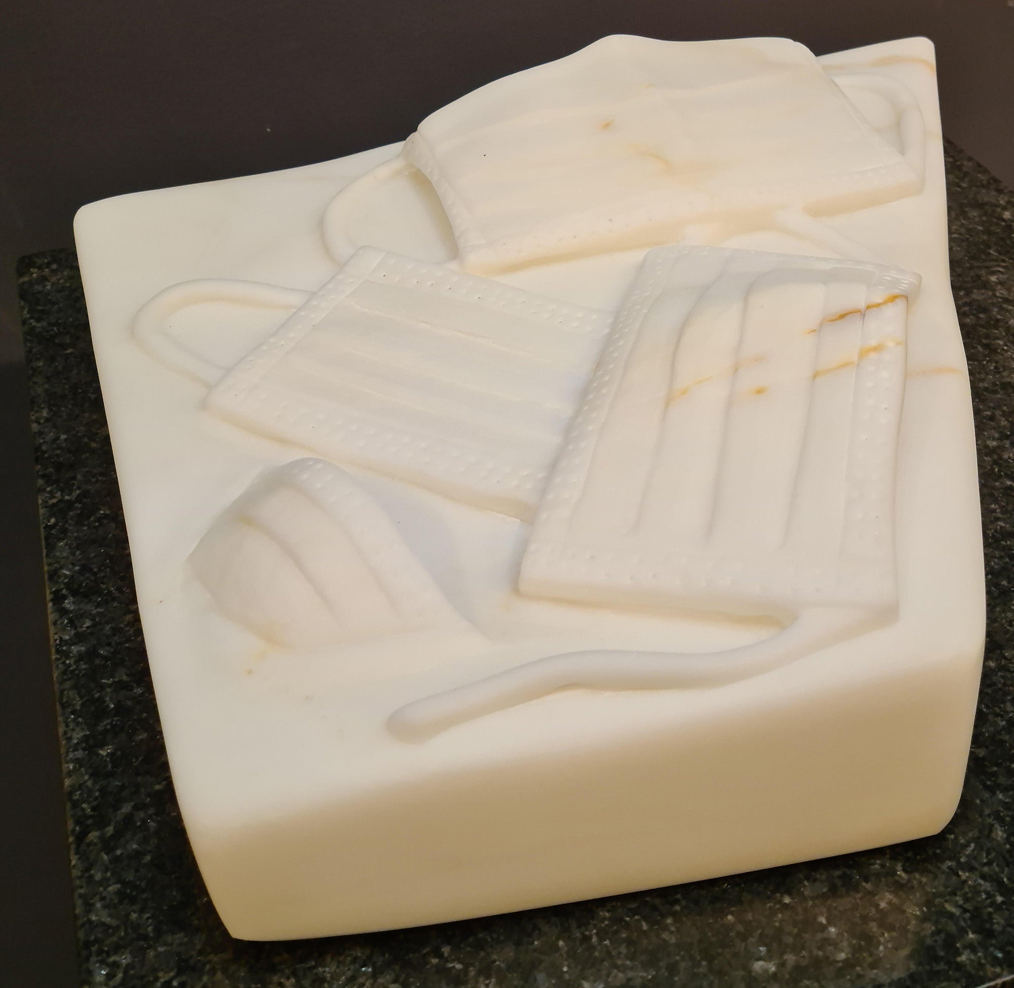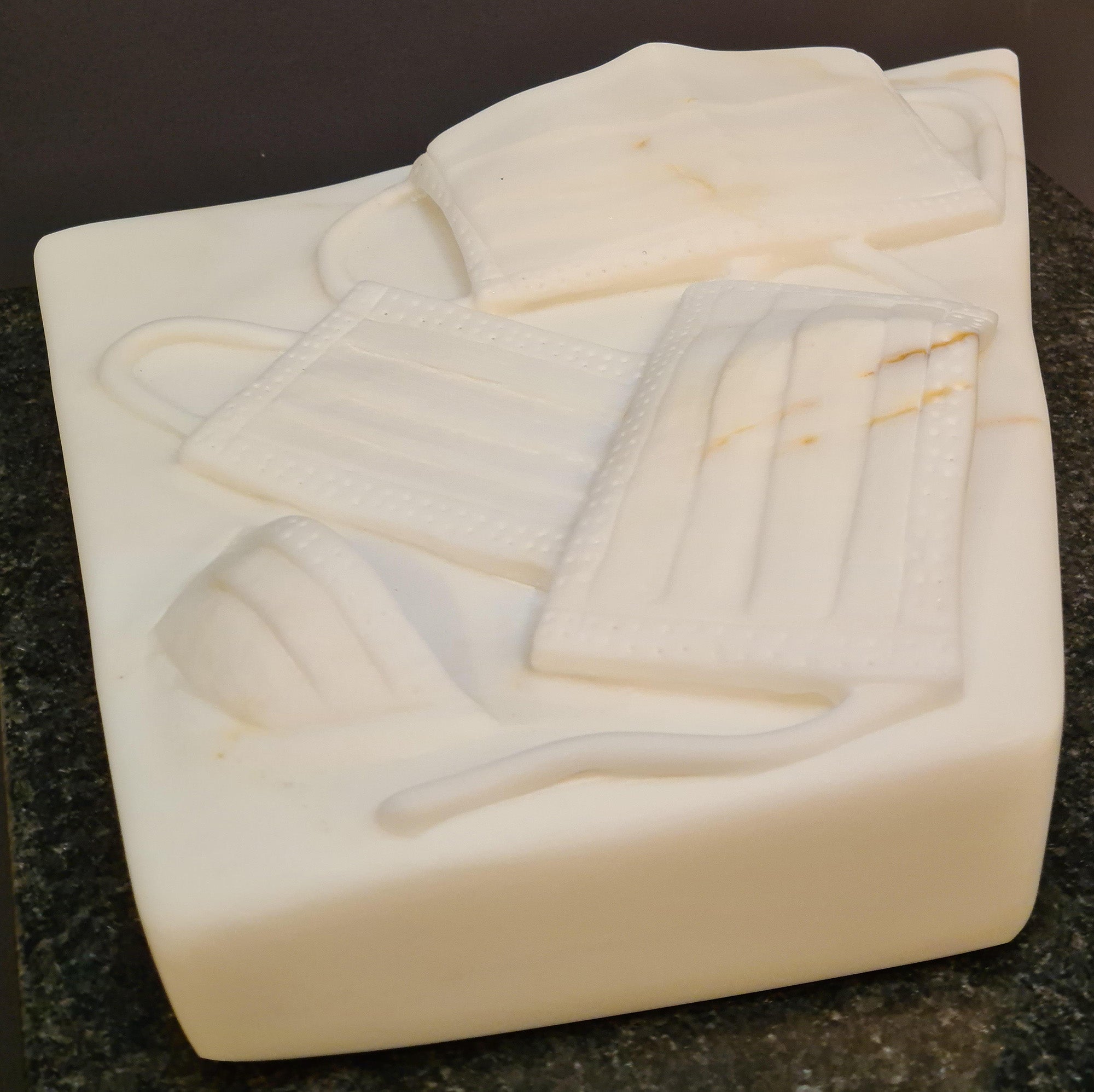 Artist Statement: The surgical mask has become the symbol of the Covid-19 Pandemic. My sculpture is symbolic of the pandemic and the importance of either having a mask or not. The availability of masks was a matter of life or death, in some circumstances. The sculpture was carved to remember the sacrifice and humanity of the front line workers who made such a difference in these trying times. - Roger McFarlane.