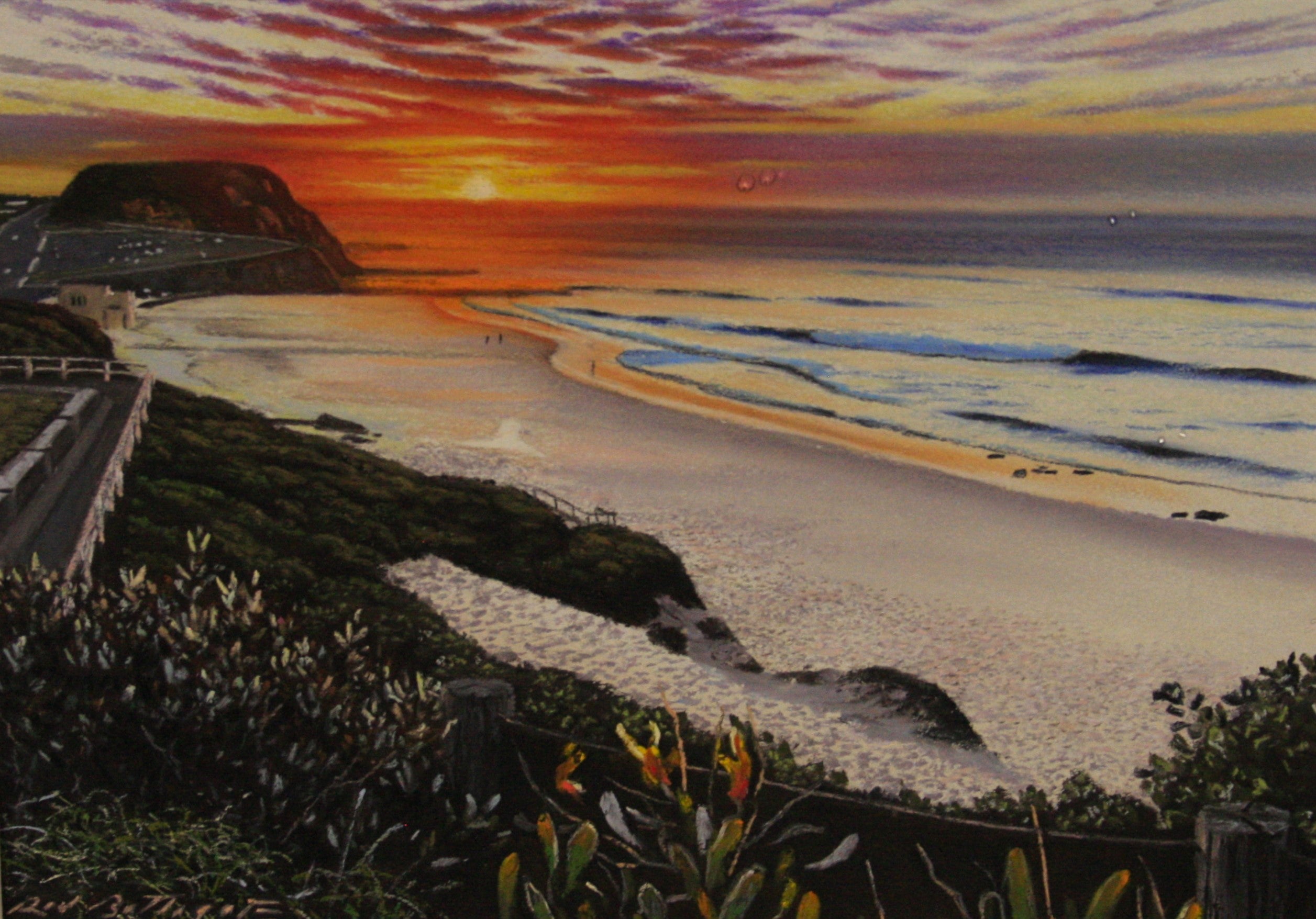 Artist Statement: A blazing dawn spreads over Bar Beach and the cliff with a native garden foreground. post card sized