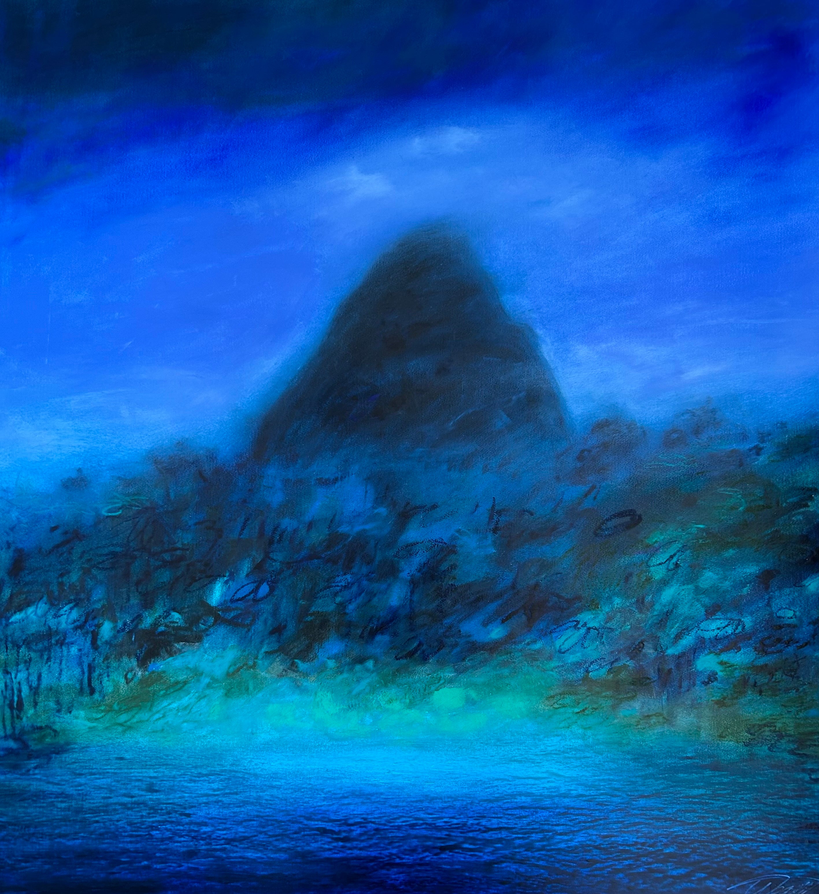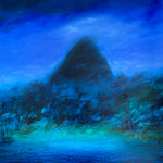 Artist Statement: presents a view of one of the region’s ancient peaks. The night sky, layered with indigos and purples forms a dramatic backdrop, amplifying the mountain’s