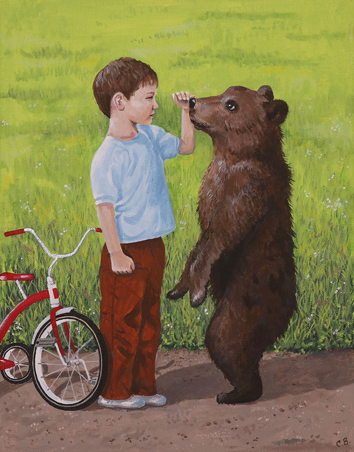 Artist comment: If a boy met a bear, what would he do? Compare heights?