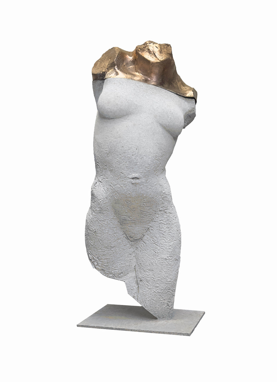 Artist Statement: “This fragmented torso evokes the timeless tradition of classical statuary, where absence heightens presence. The interplay of bronze and stone celebrates both strength and vulnerability, honouring the enduring beauty of the human form.”