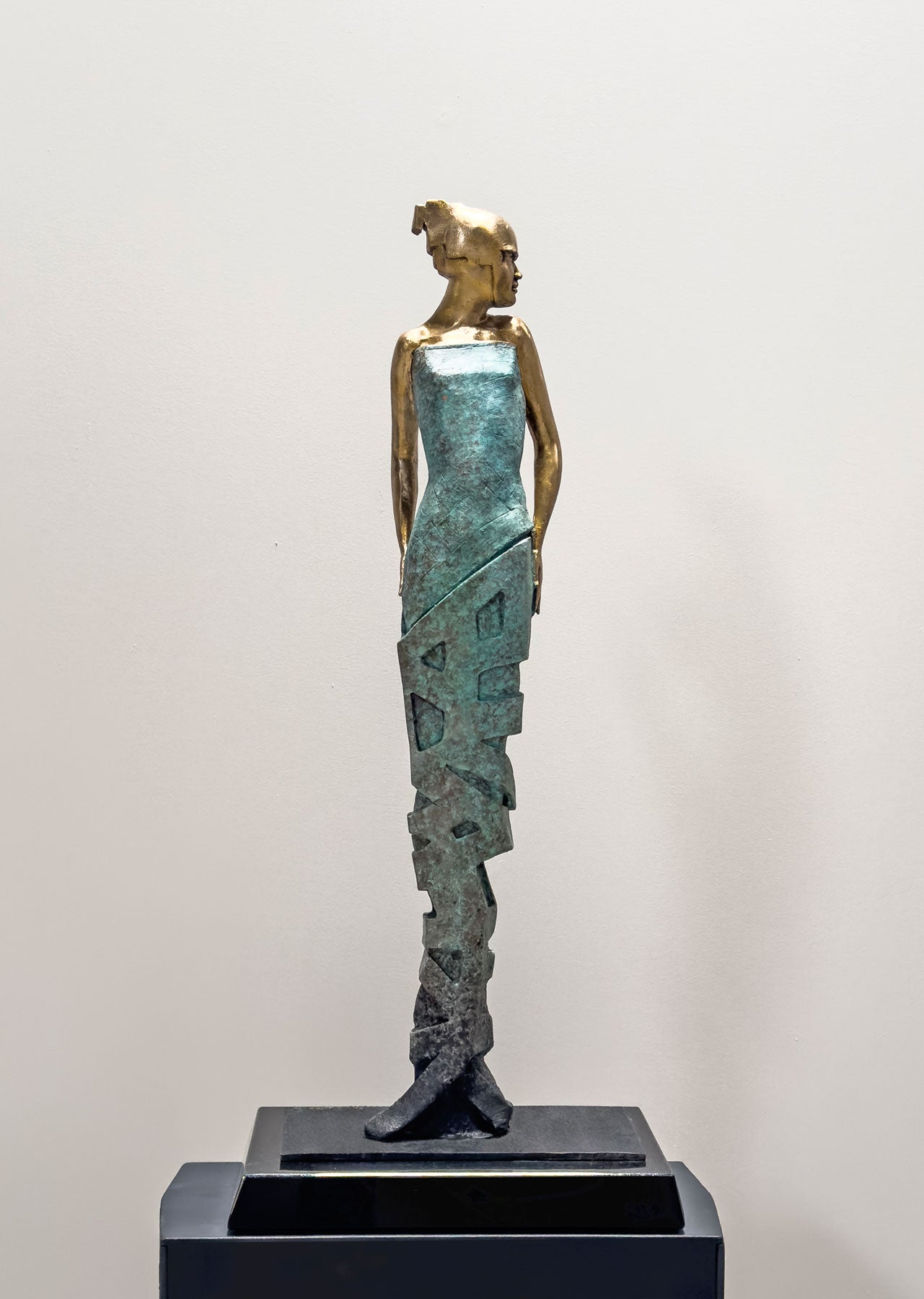 Yet like a magician compelled to reveal his tricks, Glassborow often deconstructs the process of creation. The figures are sometimes revealed in their unformed or half-formed states. For example, ‘point’ moves from an aesthetic that recalls the raw clay of the early modelling process, through a roughly finished and patinated green bronze, to the lush gold of the polished metal. The figure incorporates both naturalistic and mechanistic elements, creating a poetic juxtaposition between the material of antiquity and the imagery of the age of automaton. Find the full introduction here.
