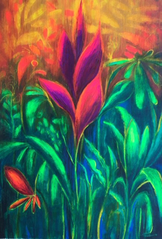 Artist Statement: This painting captures a private glimpse into the tranquility of a balinese garden. The iridescent greens contracts with the dark greens and blues and the yellows, gold and oranges, quietly inspired by a silk textile factory.
