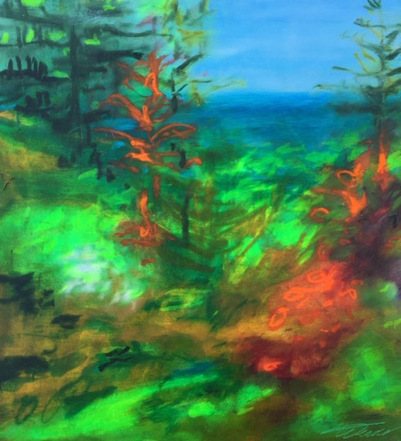 Weaver’s art is almost an optical illusion, where colours are silhouetted. An ethereal land- or seascape is generated by her layering of oil pastel. This medium is not successfully understood by most artists.