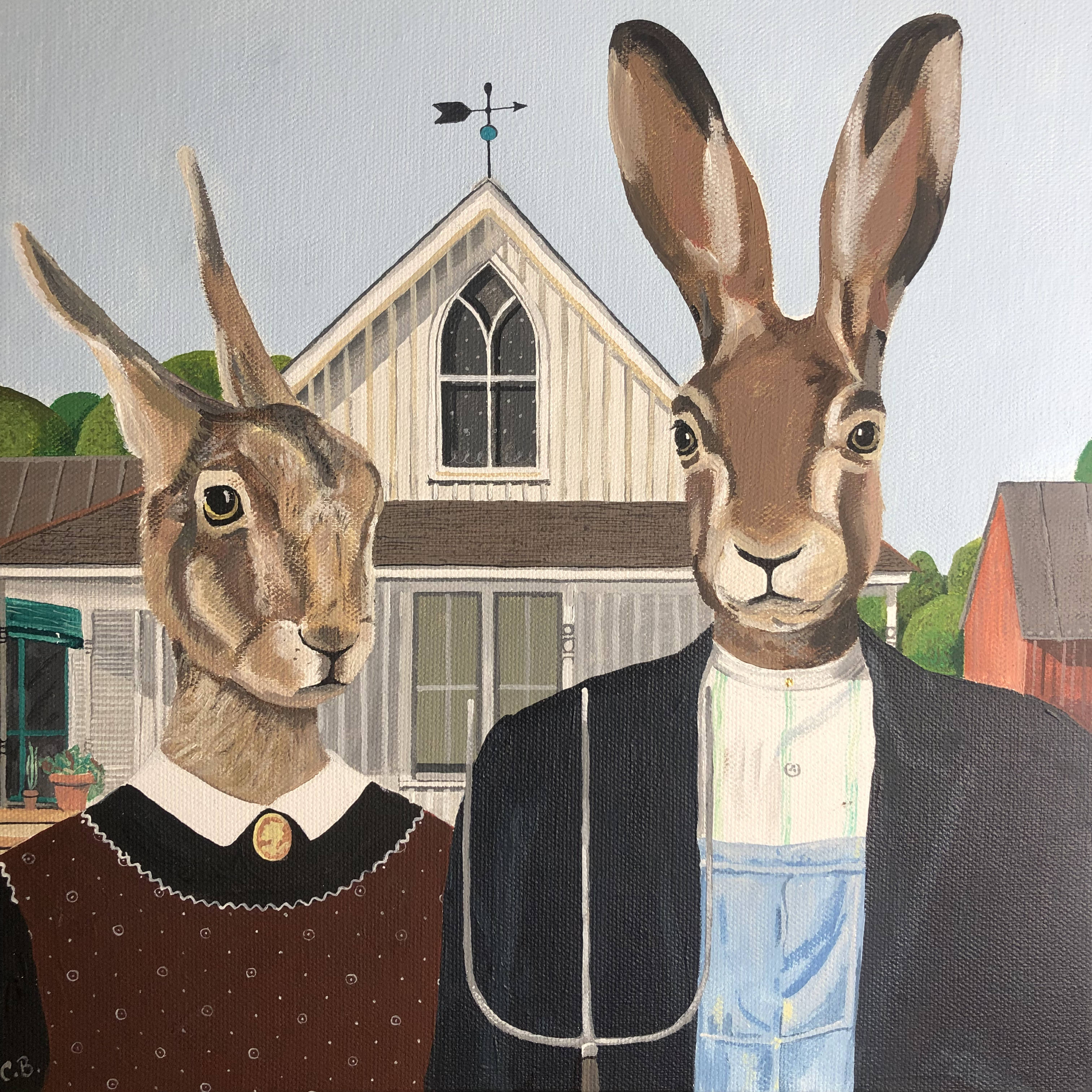 Artist Statement:  There are hundreds of appropriations of Grant Wood's "American Gothic", with every variety of tongue-in-cheek quirkiness. I don't feel bad about adding my own, given that mr Wood intended to depict absurdity in the original. This is just a slightly different absurdity - Catherine Banney