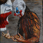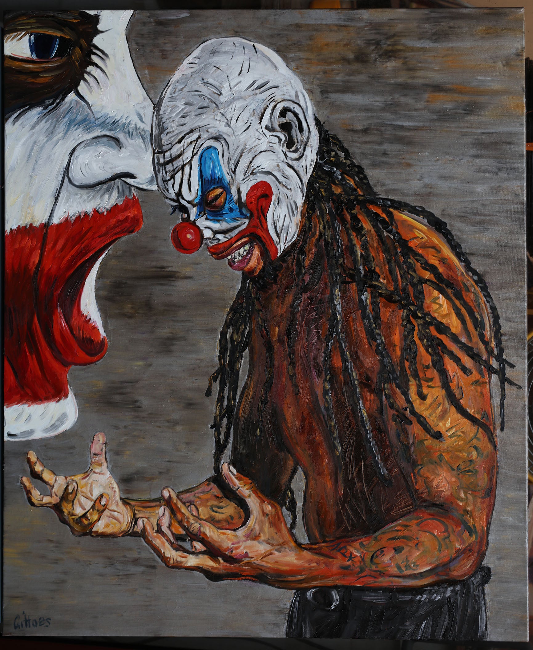 Artist Statement: This is one of the best and most important works of my career. Any price would be too little! Whoever is wise enough to buy this will be doing very well. It is the same size as 'Crowd Pleaser' and is the same series although not the same size. I used Elliot as my model in Miami back in 2016 - November as America got ready to elect Trump. The background was a huge mural someone had done of Trump as a Clown like the Joker from Batman. The clown mask was made in Mexico. I have a collection of them. There is a work from this series called 'Scream' in the NAG show.