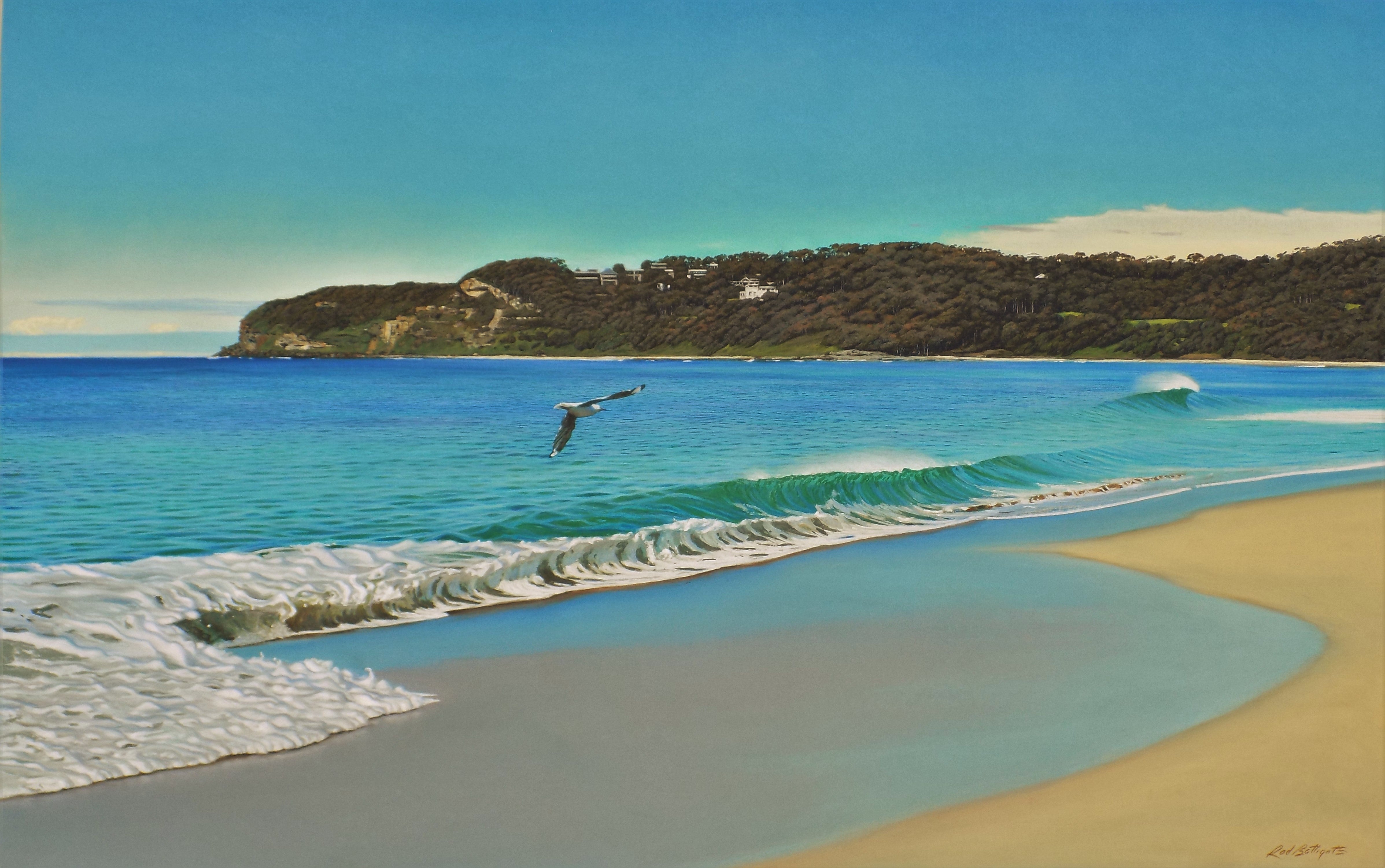 Artist Statement: A lone gull sweeps over a foamy shore break as a clean peak heads towards the beach. Dudley headland backdrops the open stretch. - Rod Bathgate.