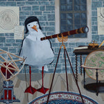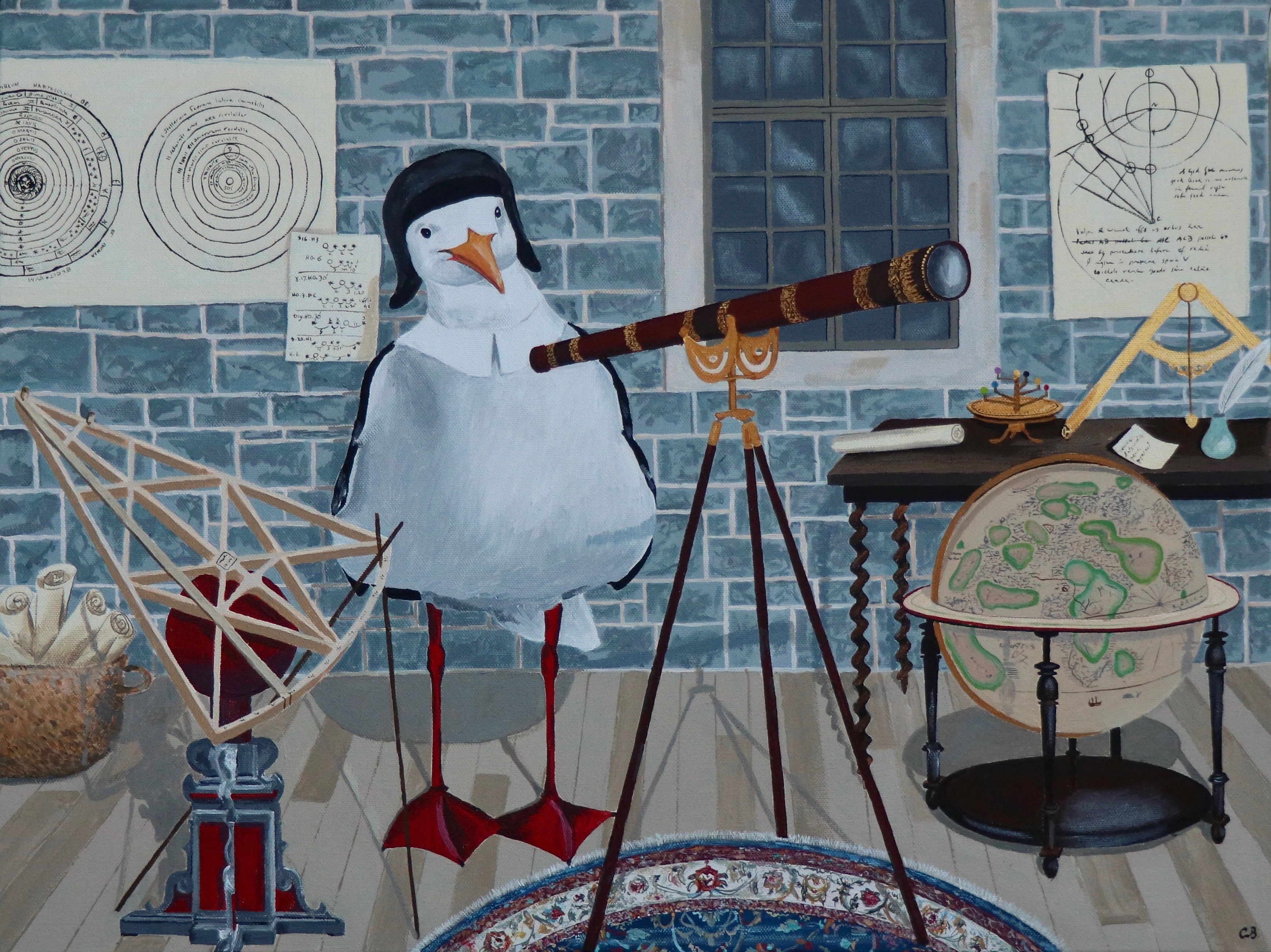 Artist Statement: Inspired by the obvious pun on Gallileo’s name, this painting contains references to the work of the famous astronomer and his contemporaries. The scientifically-minded may like to see if they can identify the content of charts on the wall. Catherine Banney