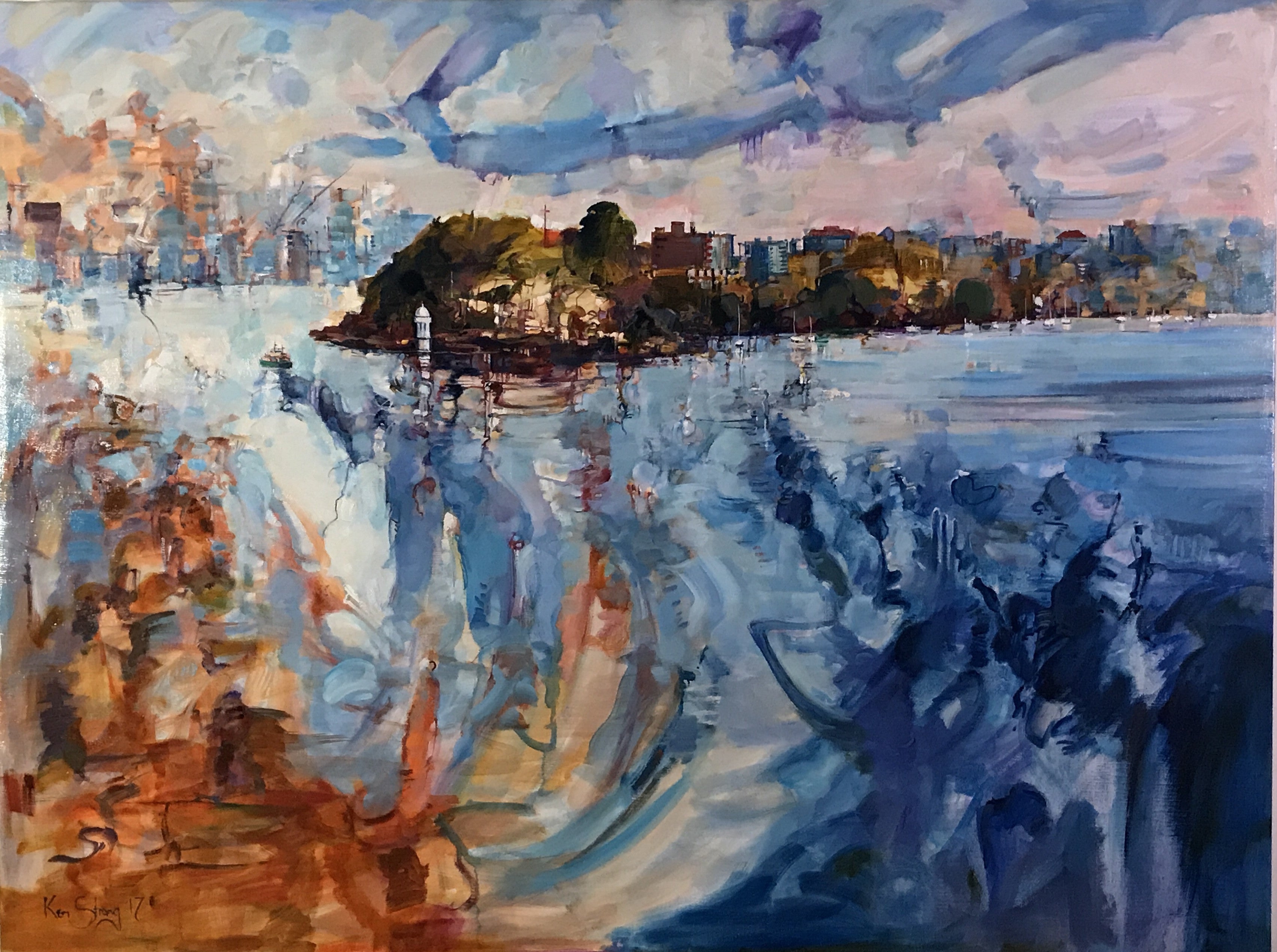 Artist Statement: A regular but eventful path taken by the inner harbor ferries. Winding their way around the headlands and moored obstacles moving from the dark deep waters of the quite bays into the main harbor thoroughfare. - Ken Strong.