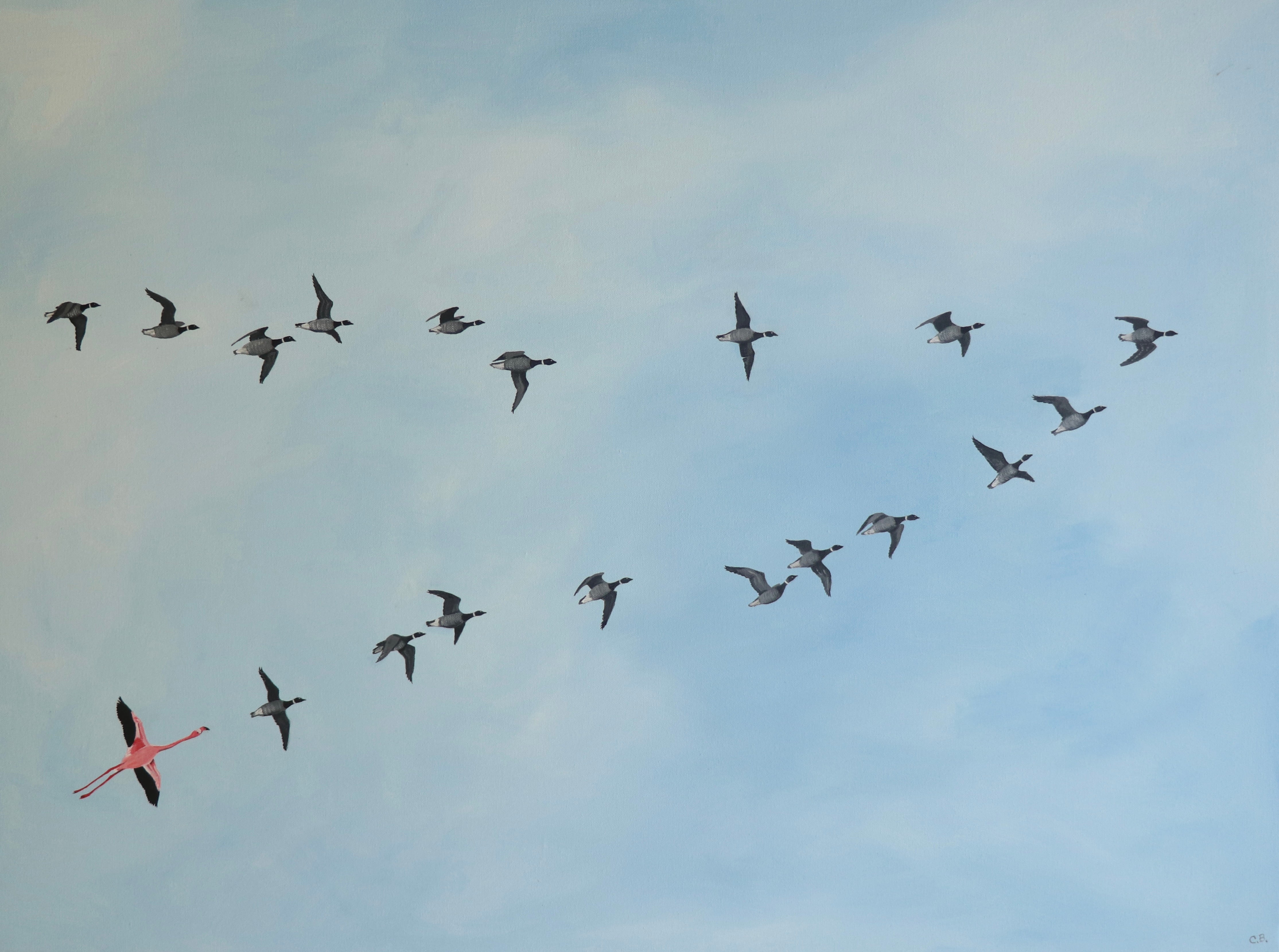 Artist Statement: These are Brant Geese, which migrate from Northern Canada to warmer climates in winter. Who knows where they picked up the flamingo?