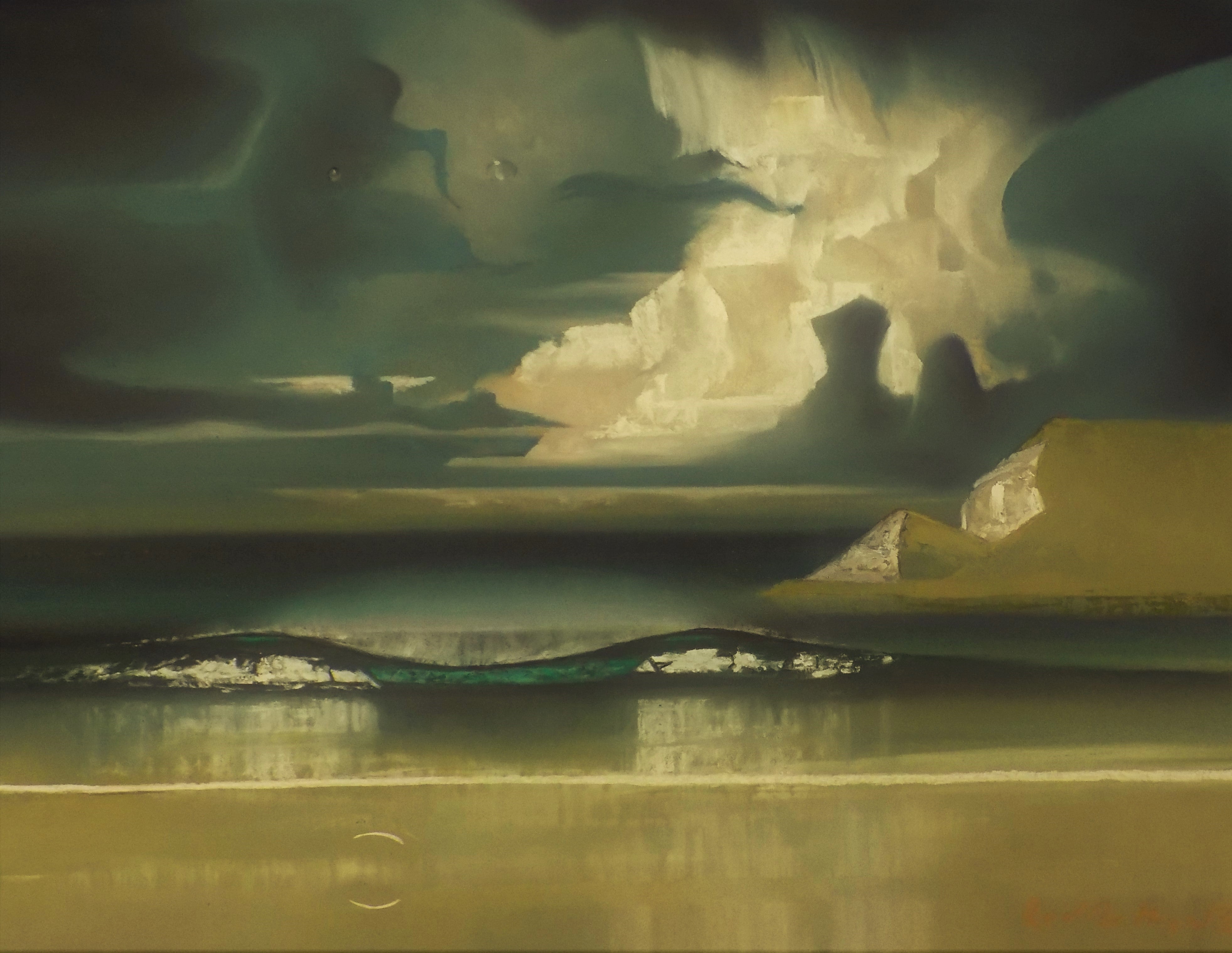 Rod is not only accomplished with pastel on paper and board, but equally so in oil painting. Photo like complicated compositions detailing, light, water effects and beachscapes with a figurative aspect are what we expect from this artist.