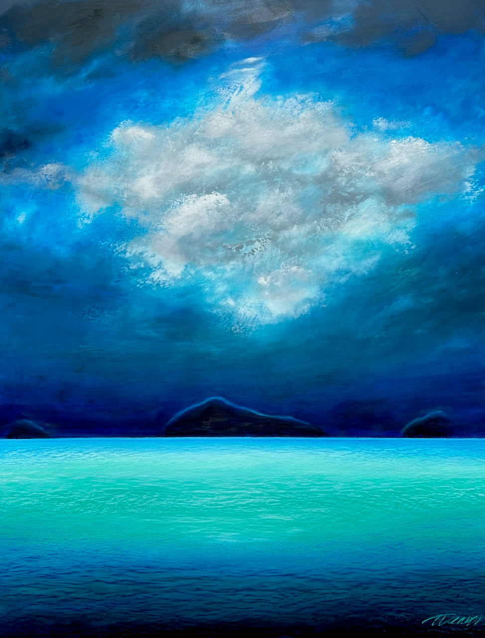 The hyper-romantic imagery is another striking feature of this unusually cohesive body of work. Bushfires or volcanic eruptions burst over cool oceans, islands seem to float over the horizon, portals of light open up a vertical passage between ocean and sky. Many of the images speak to a moment of transformation: fire, storm, the giant orb of a full moon blooming in the sky. There is a sense that something is about to change, some truth is about to be revealed, a final destination reached. It is possible to read them as drawing a parallel between physical landscapes and the dream-like landscapes of the mind. With their focus on the meeting of opposites- fire and water, earth and air- they speak to alchemical processes and psychic transformation. They evoke a sense of a something that is unknown yet familiar, an impossible dream that is still deeply felt to be real. Find the full introduction here.