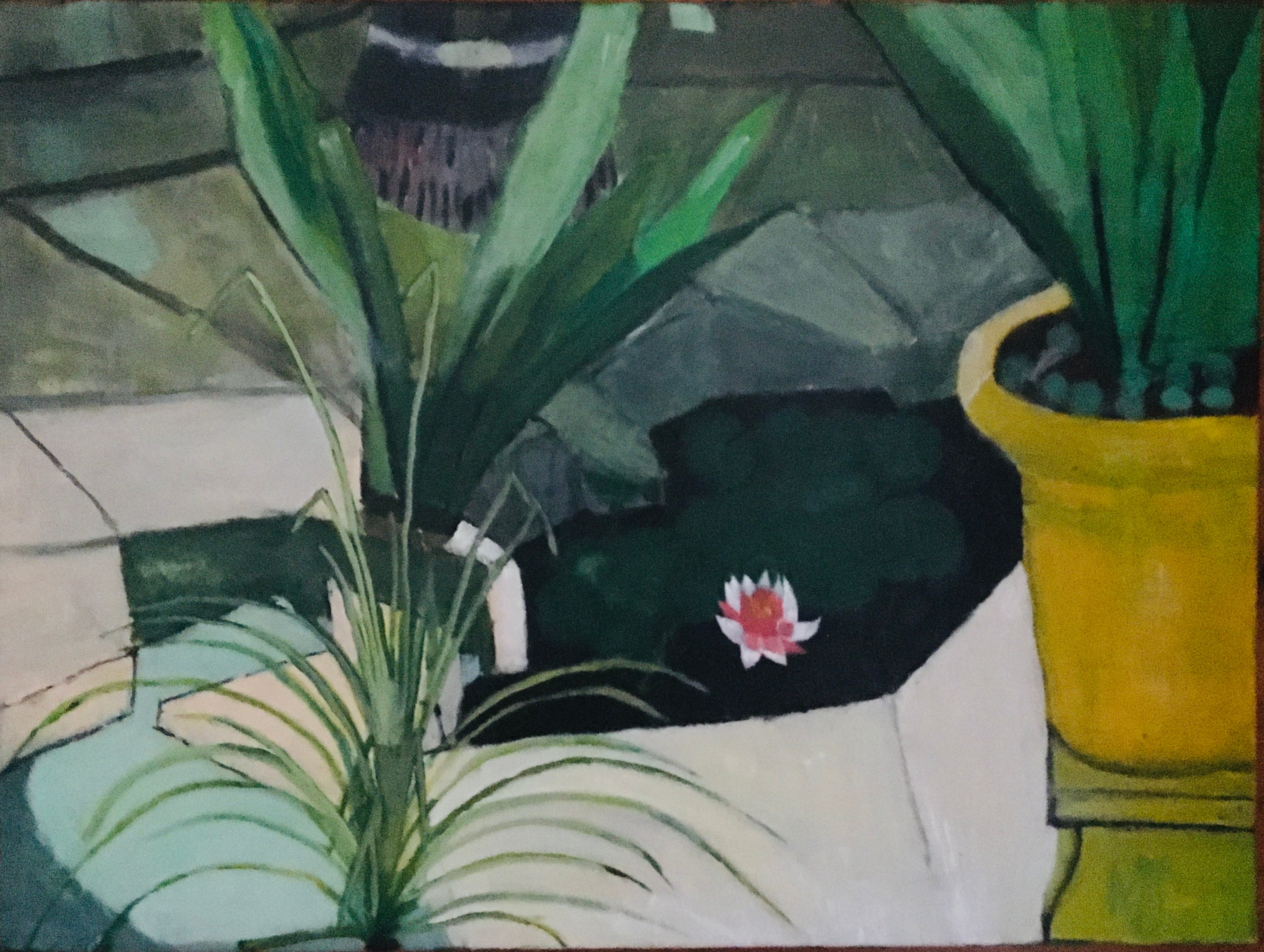 Artists Statement: Another example of my water terrace with bird's nests, water lilies and strappy plants. A substantial pot adds to the drama. A relaxing place to paint. - Malcolm Jones