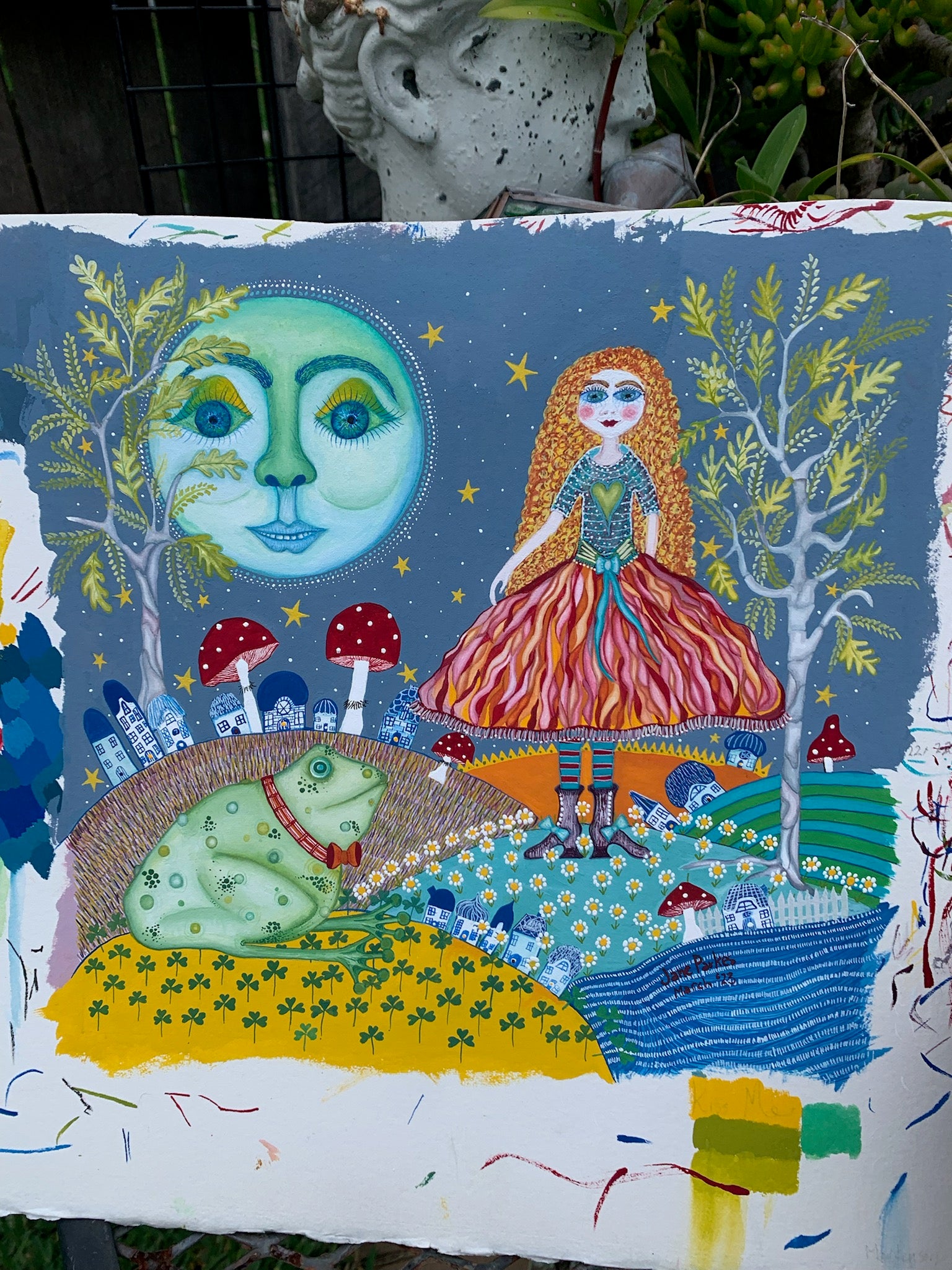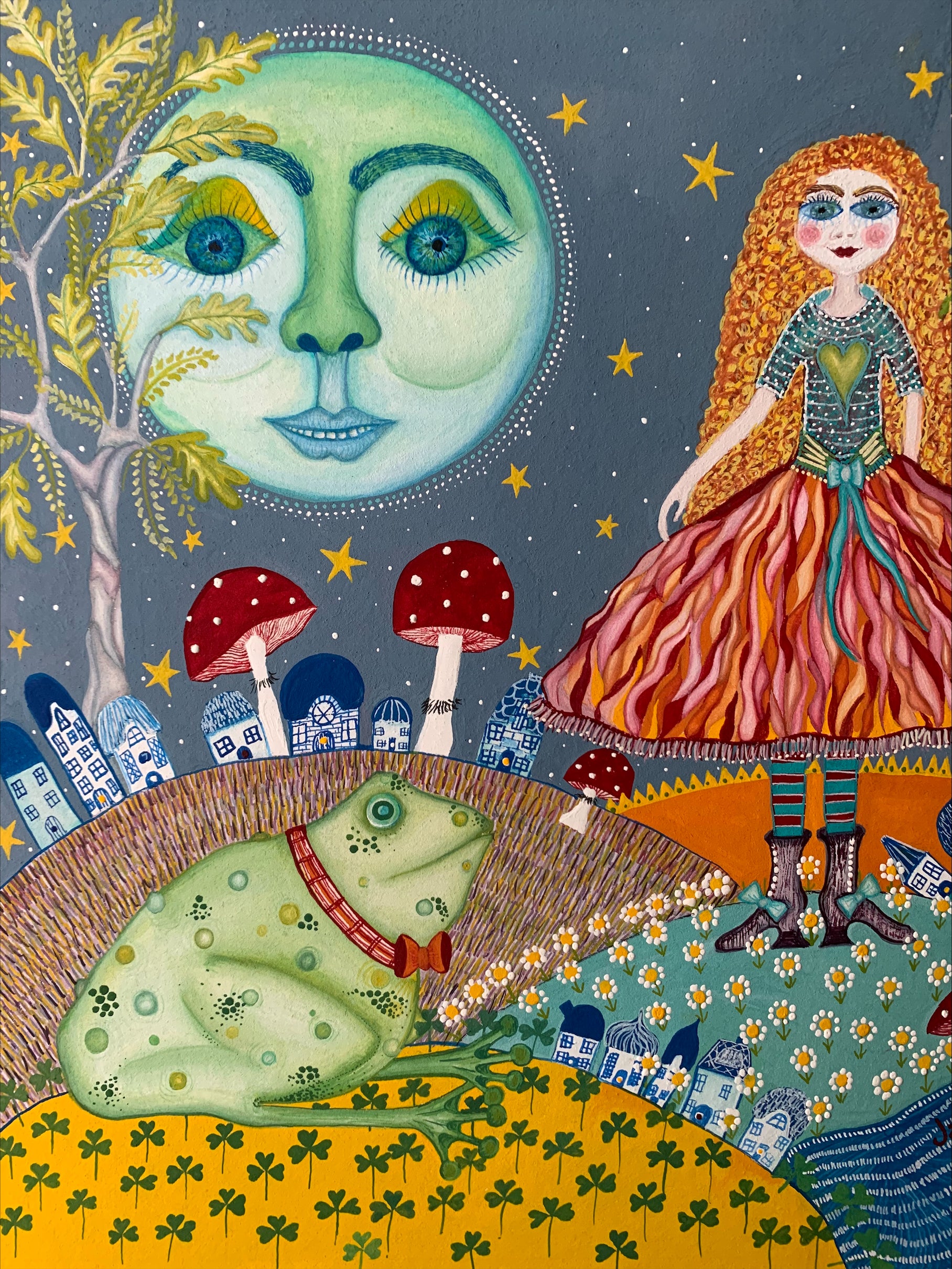 Artist Statement: The long haired, pretty little girl is insisting the frog kisses her