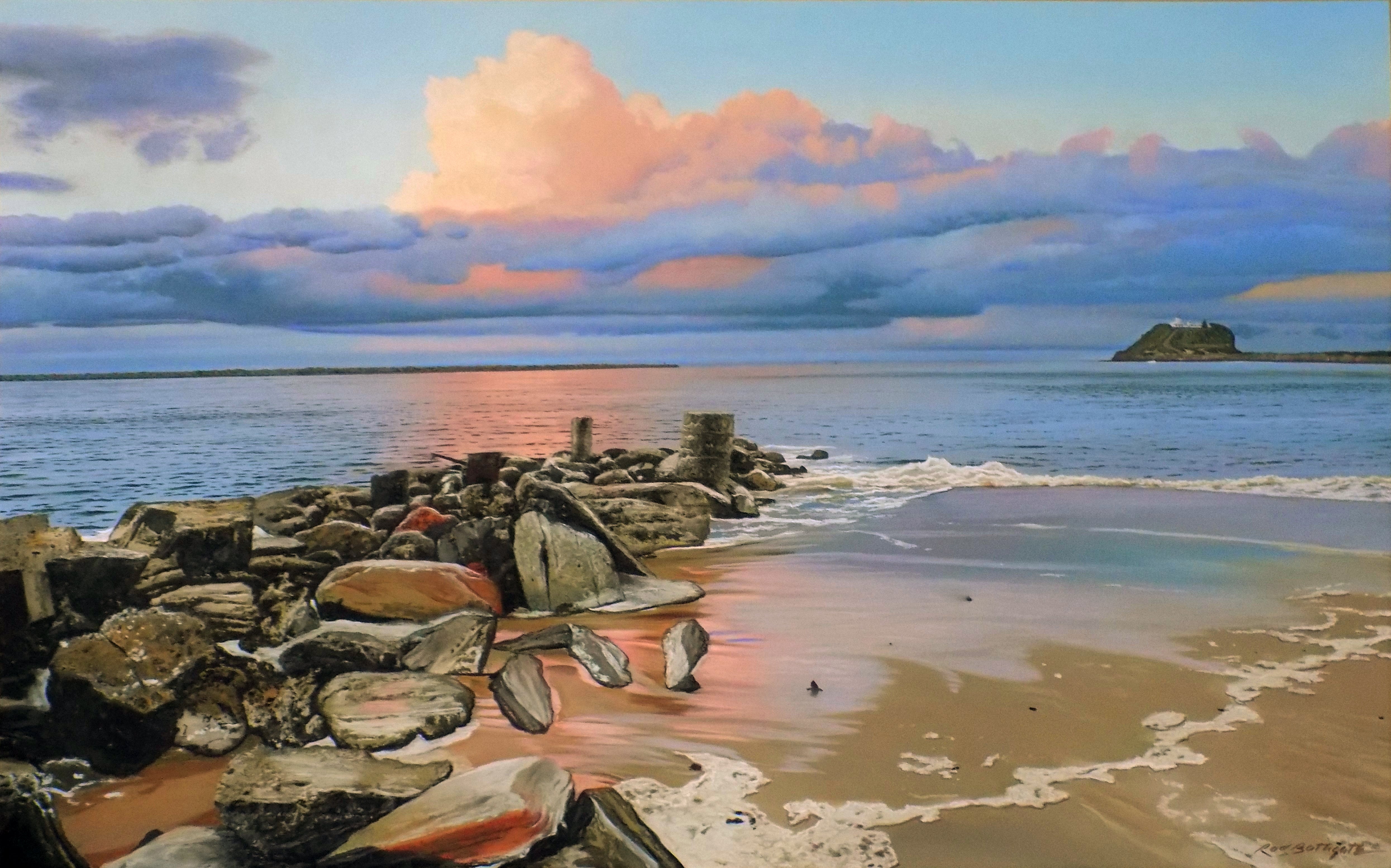 Rod is not only accomplished with pastel on paper and board, but equally so in oil painting. Photolike complicated compositions detailing, light, water effects and beachscapes with a figurative aspect are what we expect from this artist.