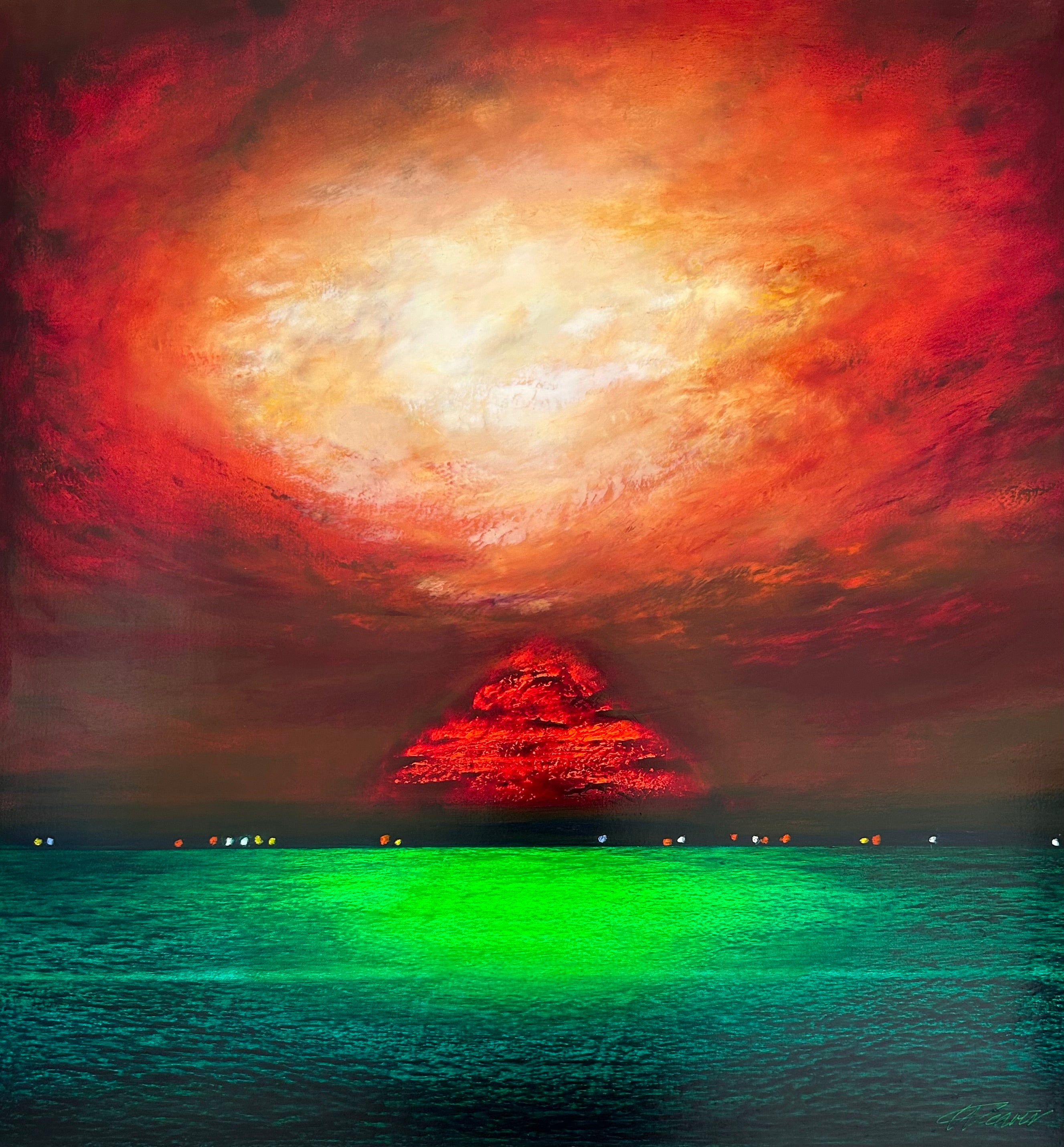 Artist Statement: This artowrk depicts a distant volcanic island rising behind an emerald sea. Along the horizon scattered lights suggest a human presence tracing a quiet line between sea and sky. Above, the moon is veiled by clouds, it’s hidden