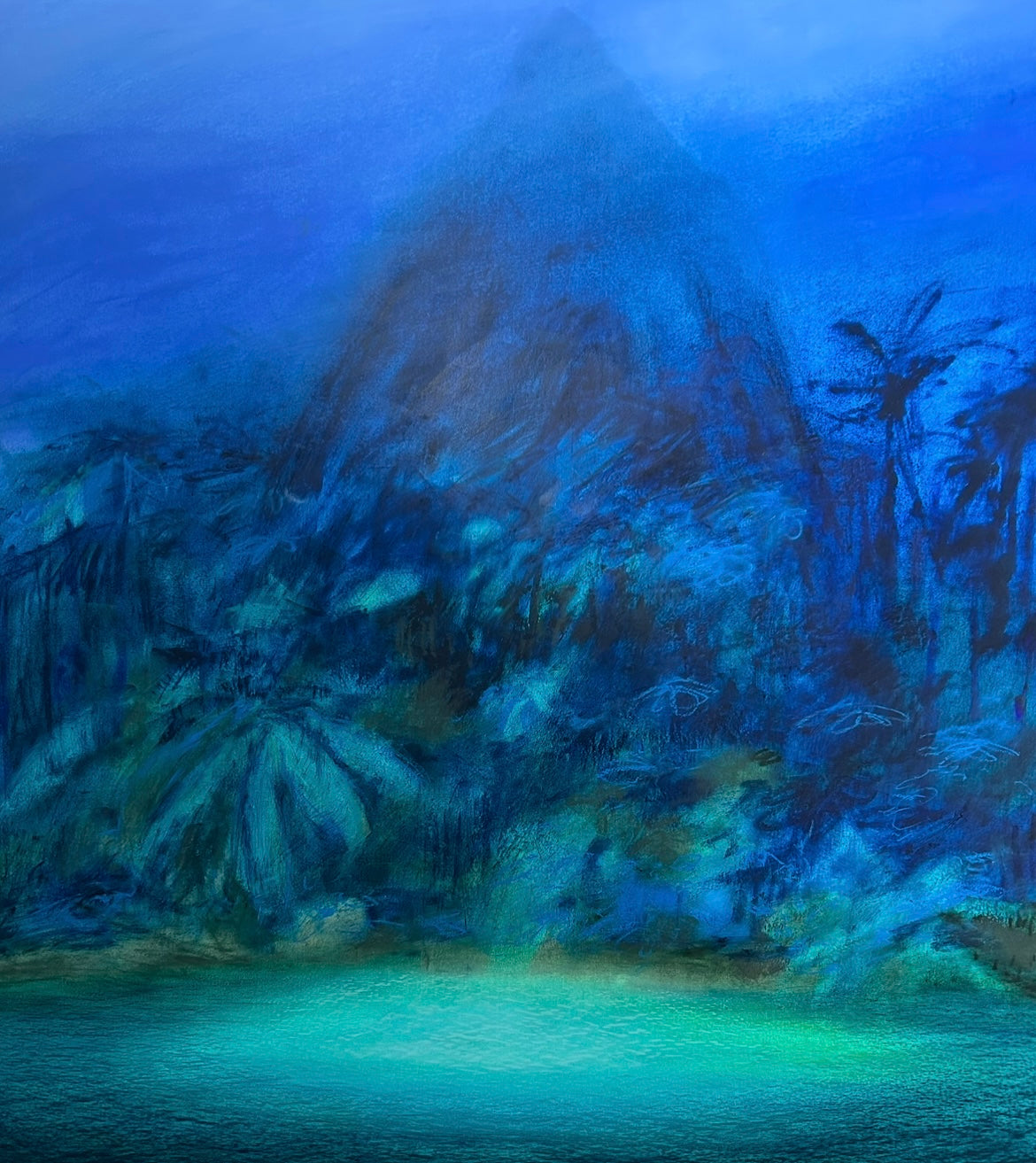 Artist Statement: This artwork captures a moment of stillness and reverence within the Kin Kin hinterland. In the foreground, a pool of water gathers and reflects light, creating a quiet focal point that evokes a sense of the sacred. Behind it, a peak rises, anchoring the composition with its enduring presence.