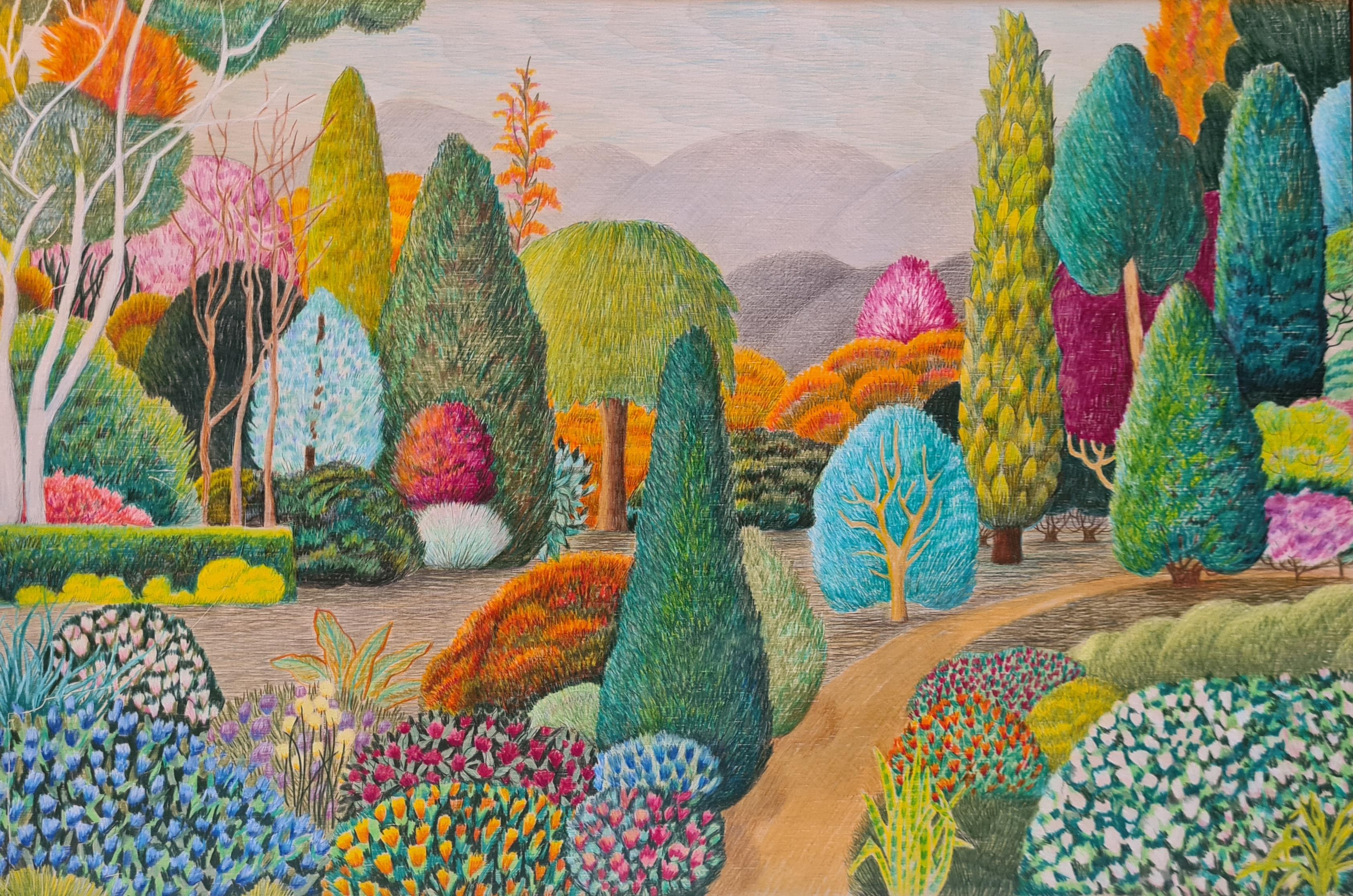 It has been a period of deep reflection and for this I am so grateful. The painting 'Silver Lining' is aptly named as it is symbolic of the great side of being in solitude - a mass production of work that otherwise would not have come to be. I breathe in the fragrant air up here and that alone is inspiration but on top of that there are endless vast and luxurious gardens full of colour and form to wander through. I feel this was meant to be a sign to pause from my other life of Argentine tango and socialising and concentrate fully on my art. I start with a vision in my mind’s eye then do rough sketches but never anything concrete as I love to 'doodle' and allow the painting to develop by itself. I feel like a medium just recording this event. I generally work with memories of childhood, mixed with the contrast of geometric shapes of man-made objects and houses and the soft forms of trees and shrubs. I paint from dark to light adding texture with thin glazes, and work in oils on canvas, pencil on wood or linocut printmaking. My huge garden has been a refuge in these troubling times and I have been doing more close-up work of the flowers I find, they are so intricate and delightful and never cease to amaze me. I absorb the essence of life and recreate and interpret this in my studio, creating a sort of utopia in which to ramble".