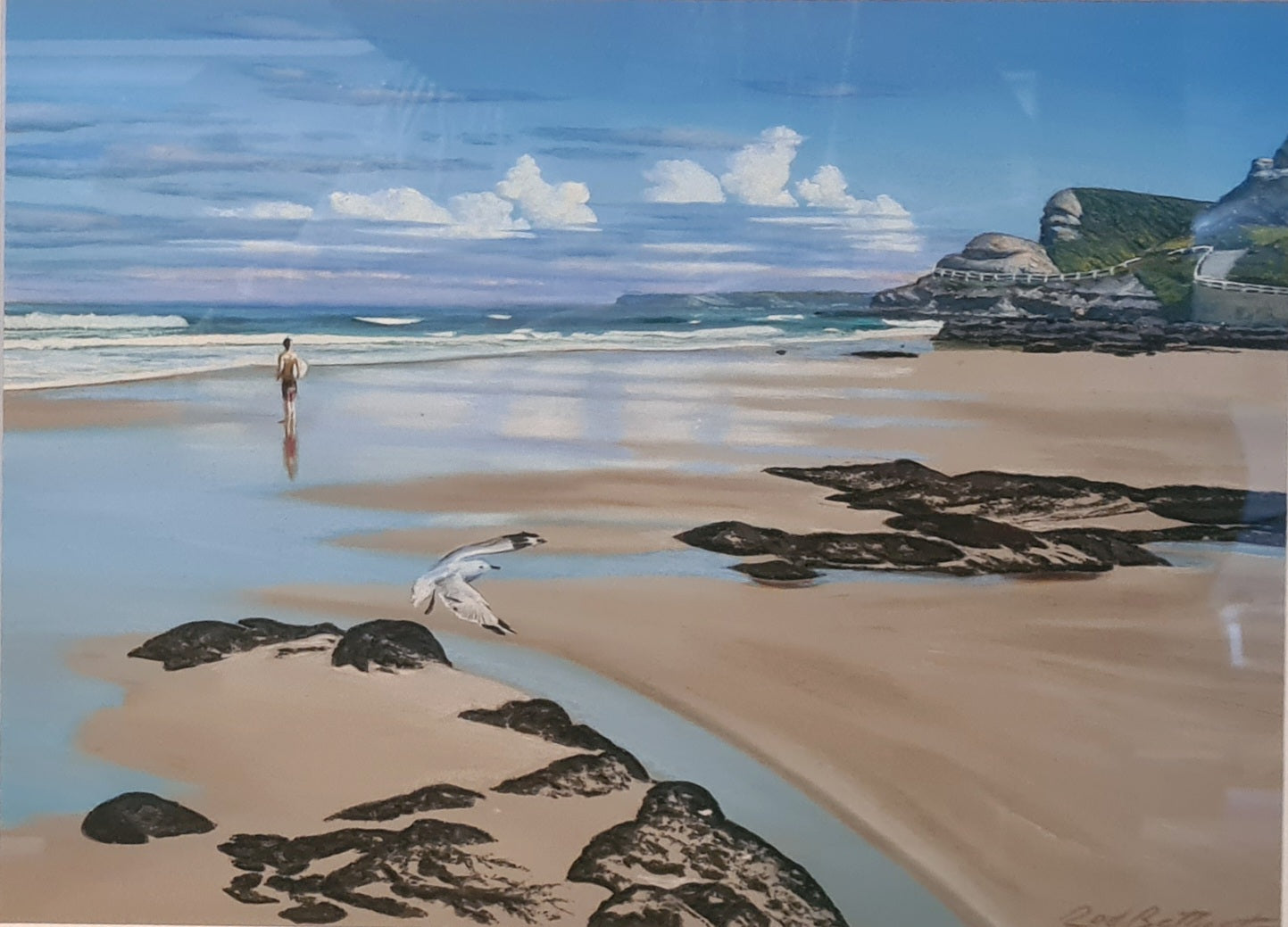 Rod is not only accomplished with pastel on paper and board, but equally so in oil painting. Photo like complicated compositions detailing, light, water effects and beachscapes with a figurative aspect are what we expect from this artist.