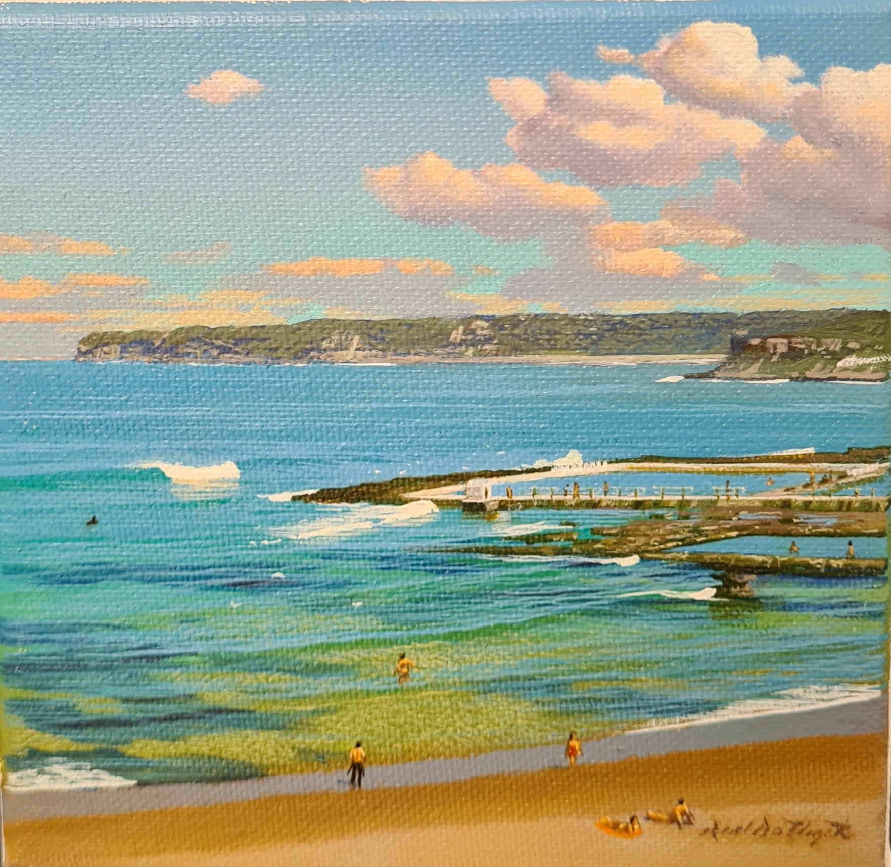Rod is not only accomplished with pastel on paper and board, but equally so in oil painting. Photo like complicated compositions detailing, light, water effects and beachscapes with a figurative aspect are what we expect from this artist.