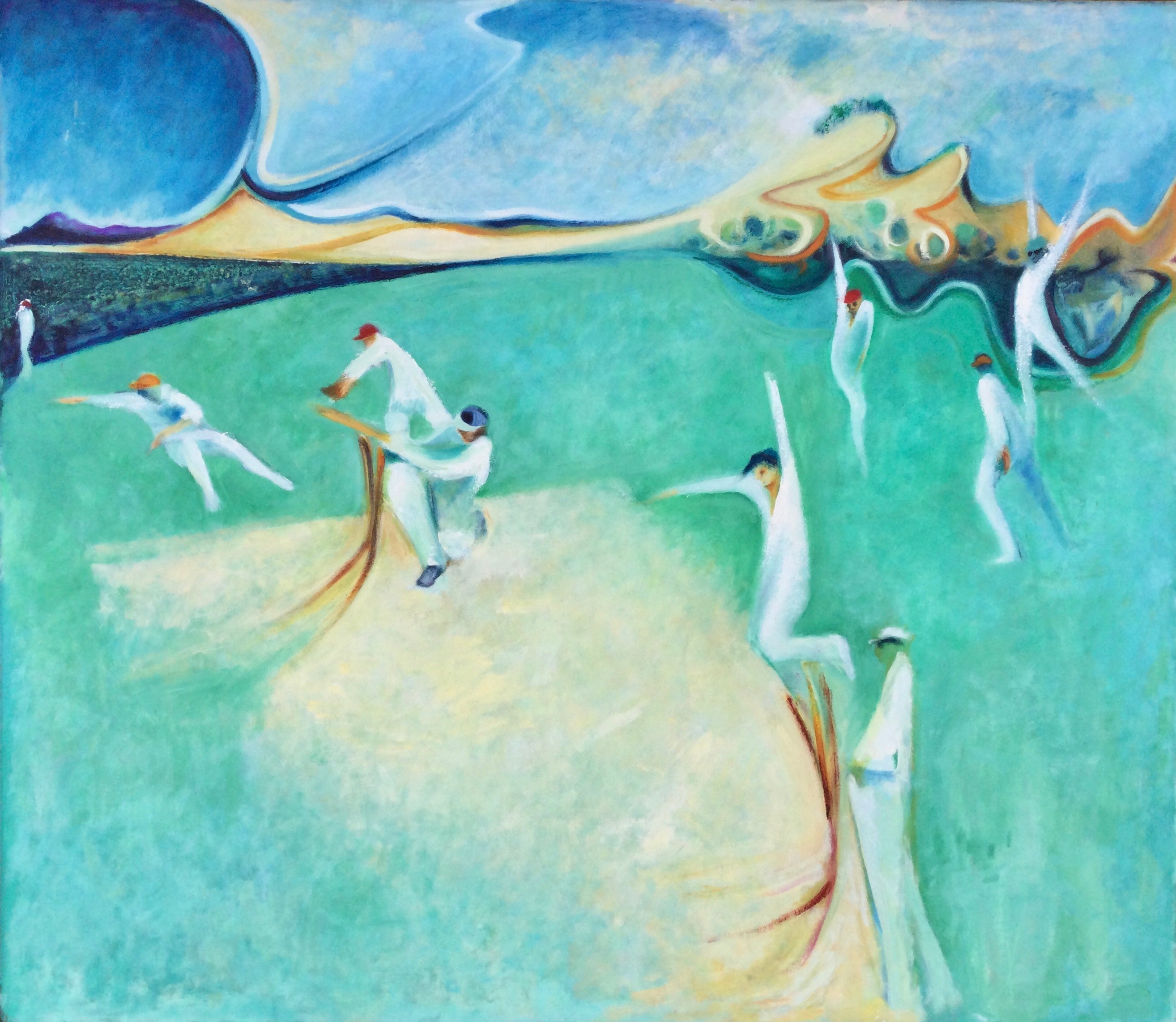 Contrasting his landscapes is Robbie’s work that exposes rural cricket teams, battling it out on parched pitches. The players often appear stylised, but are still convincing, as their painted forms capture the pose and movement of active players and matches.