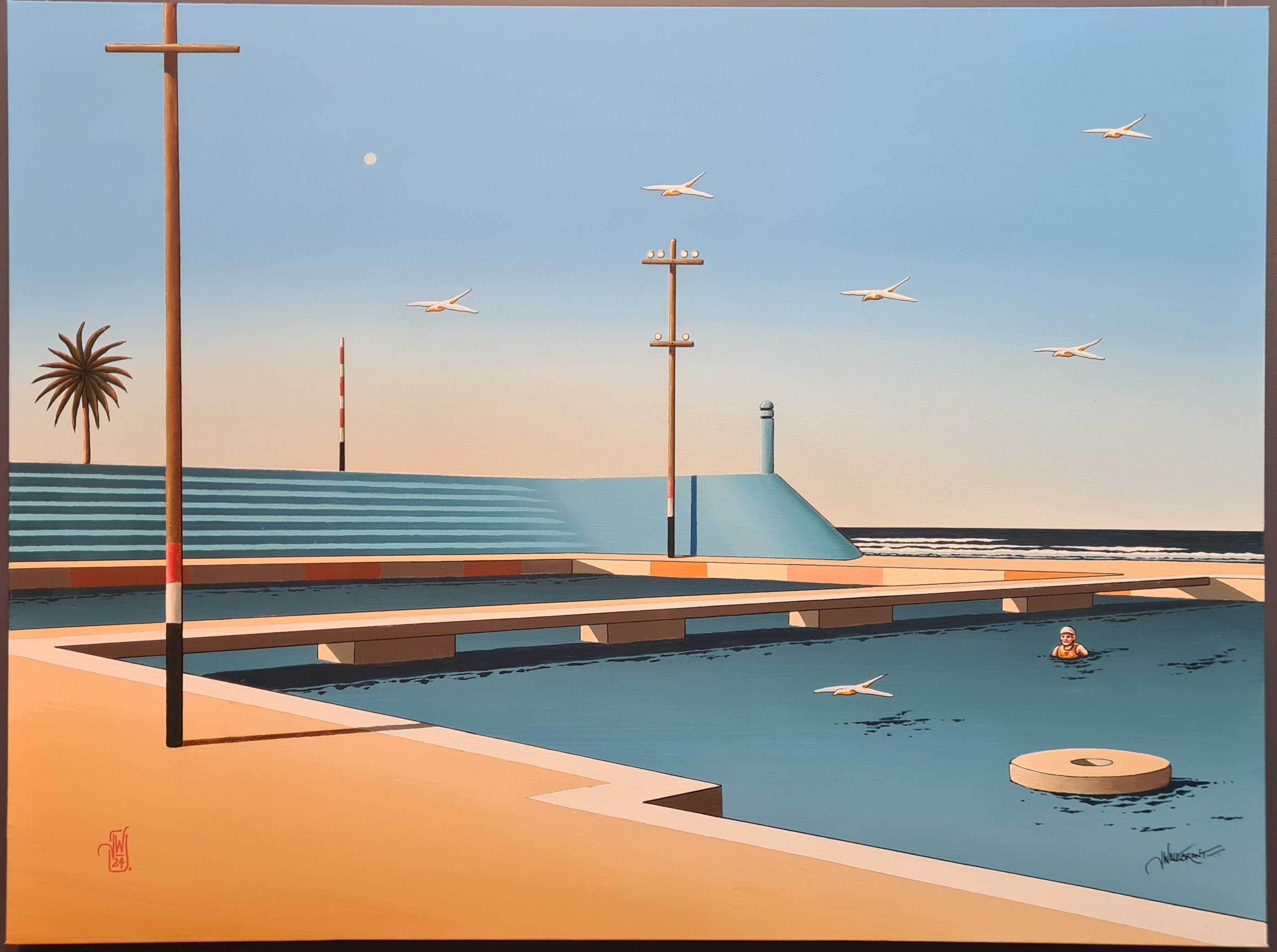 Artist Statement: My fascination with the Eastern Seaboard and its iconic architectural beauty springs from my teenage years living in Sydney’s northern suburbs and being an avid surfer and later extensively travelling the east coast in rock and roll bands. The Art Deco Bathing Pavilions, Surf Clubs and Ocean Baths - the classic surfing figure and the romance of The Surf Board-both long and short, have been a constant motif and preoccupation in my work.