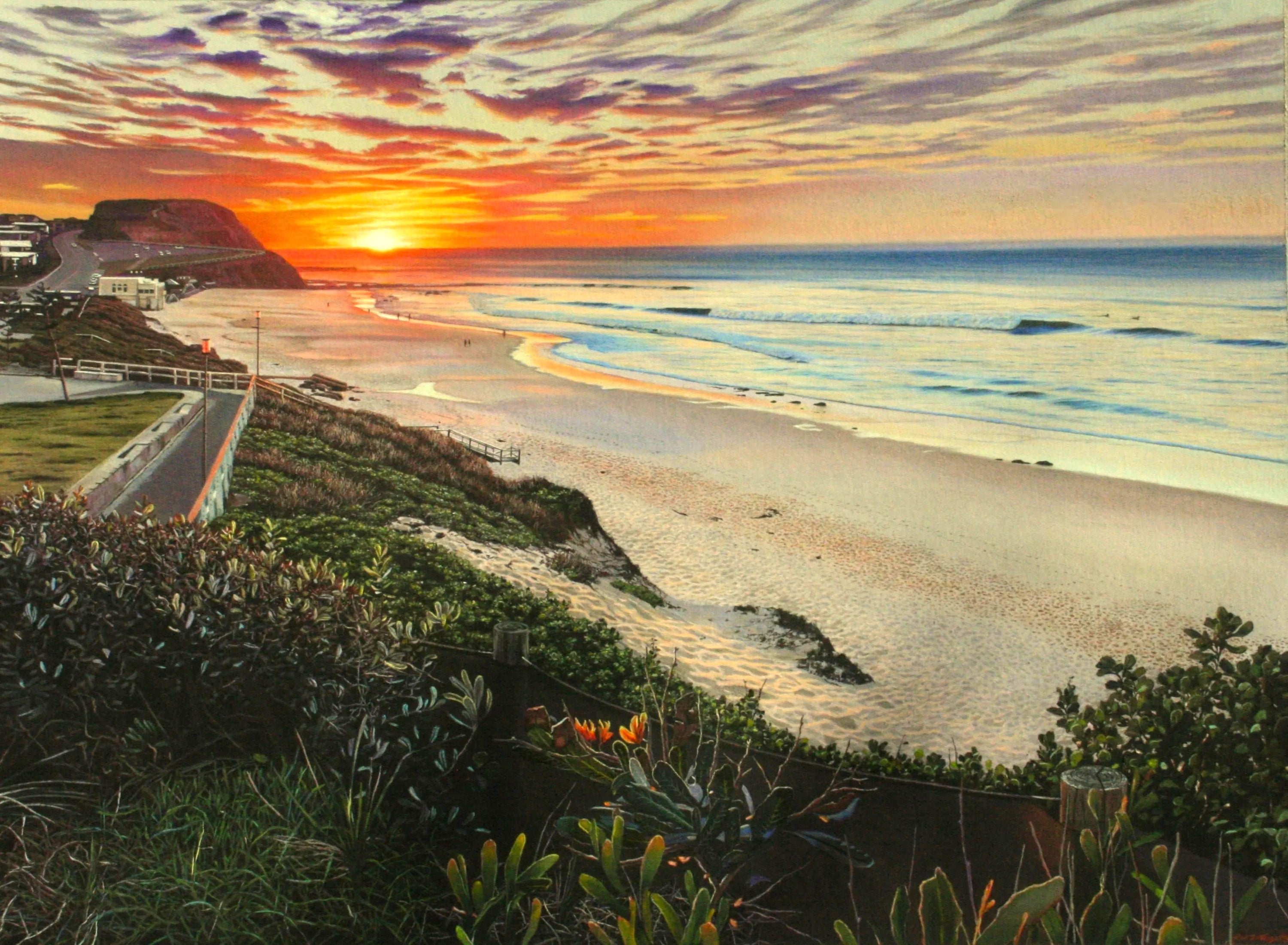 Rod is not only accomplished with pastel on paper and board, but equally so in oil painting. Photolike complicated compositions detailing, light, water effects and beachscapes with a figurative aspect are what we expect from this artist.