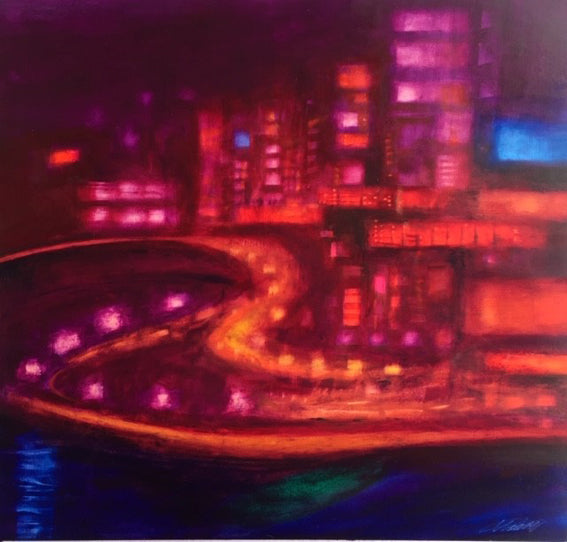 Weaver’s art is almost an optical illusion, where colours are silhouetted. An ethereal land- or seascape is generated by her layering of oil pastel. This medium is not successfully understood by most artists.