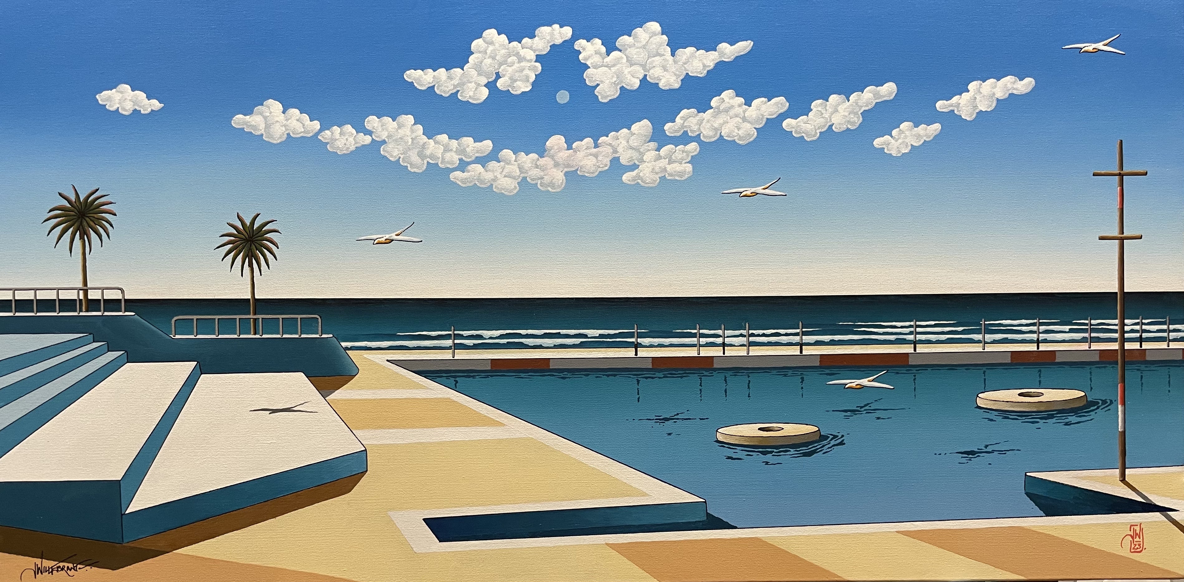 Artists statement: “Australia’s East Coast Ocean Baths have been a constant source of inspiration for my work since the late 1970’s. ‘OCEAN BATHS REIMAGINED’ is a compilation of ideas with reference to paintings of my favourite pools from the past.” - James