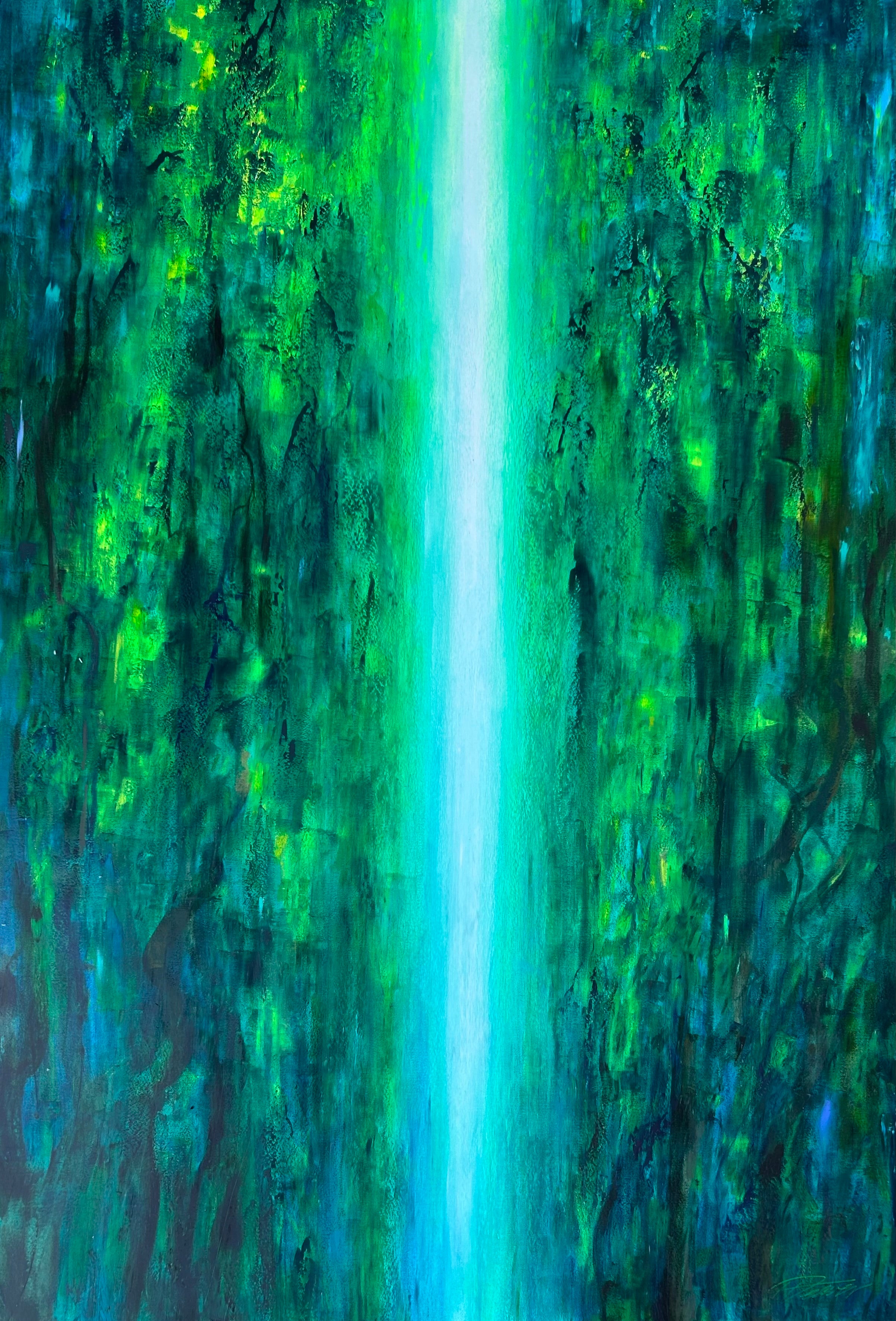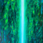 Artist Comment: invites the viewer deep into the rainforest, where layers of dappled light and rich, cool greens create a sense of immersion and stillness. The waterfall becomes a