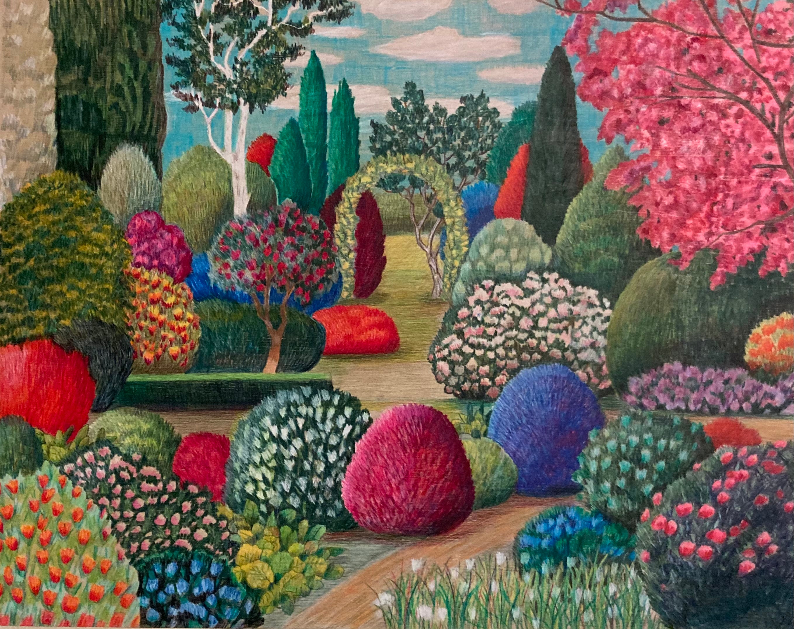 Artist Statement: ‘On Gundungurra Land’ is one of many coloured pencil drawings I have been working on since my last exhibition. It was inspired partly by a walk through a neighbour’s spectacular 5 acre property in Leura. The