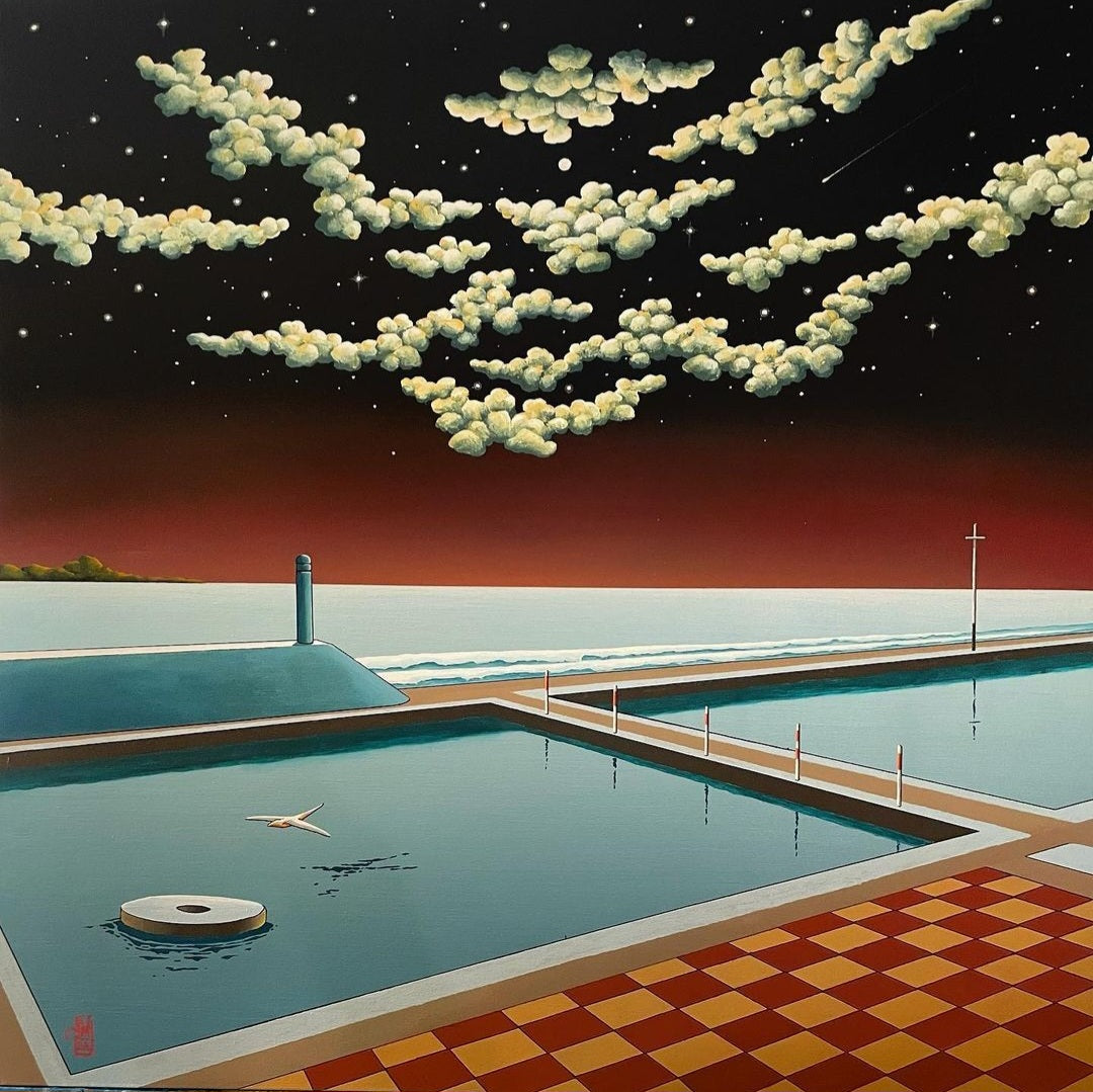 Artist statement: “’Only a Northern Nocturne’ is a continuation of my impressions of the Newcastle City Baths, at this time under an iridescent full-moon sky with my archetypal cloud formations and dancing constellations. I have yet to swim in the baths at night but this how serene and silvered I imagine it would be under a starlit sky.”