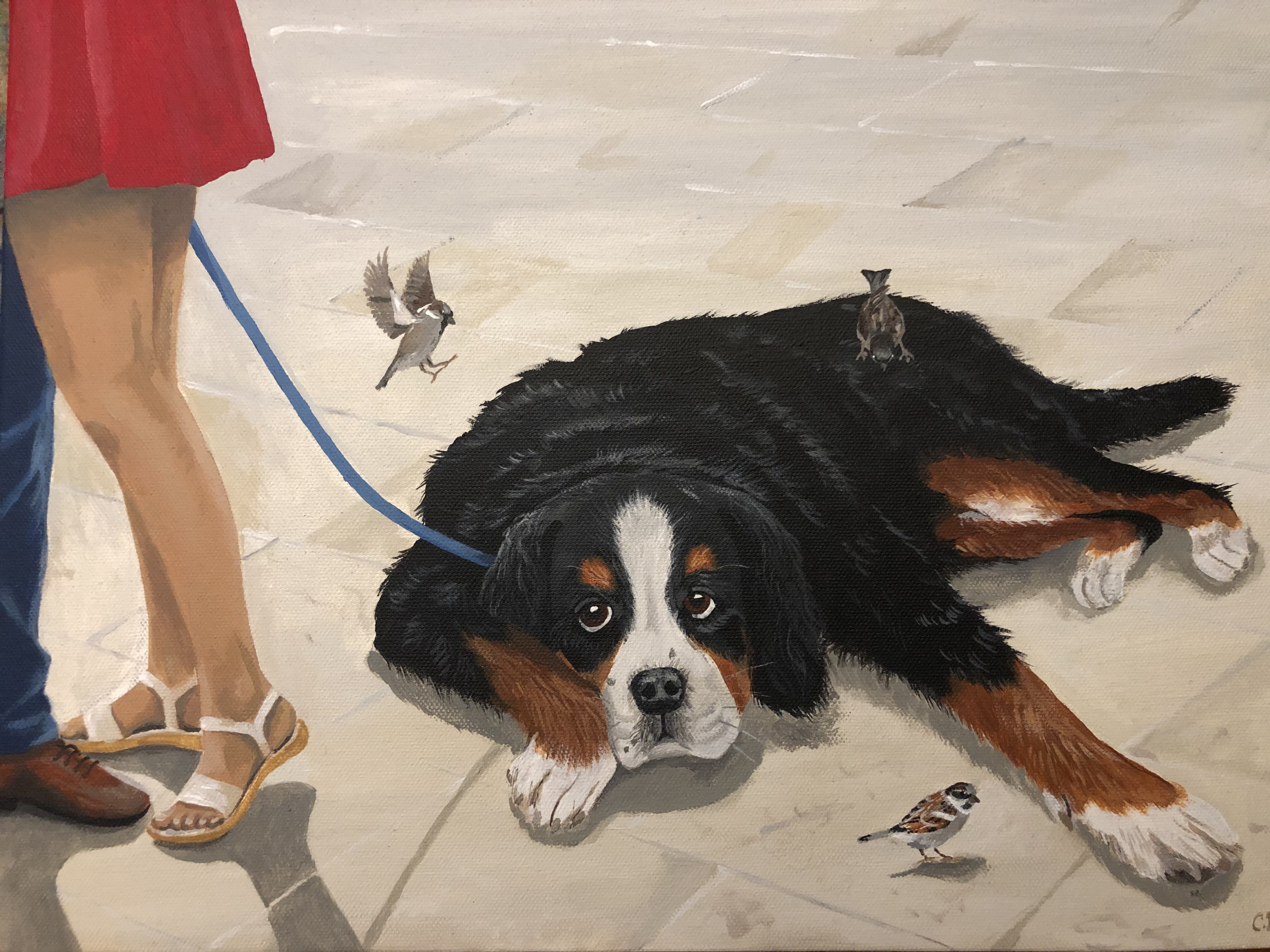 Artist Statement: I was introduced to a Bernese Mountain dog. Though huge enough to knock over small children with its wagging tail, it was also placid enough to probably let sparrows hop all over it.