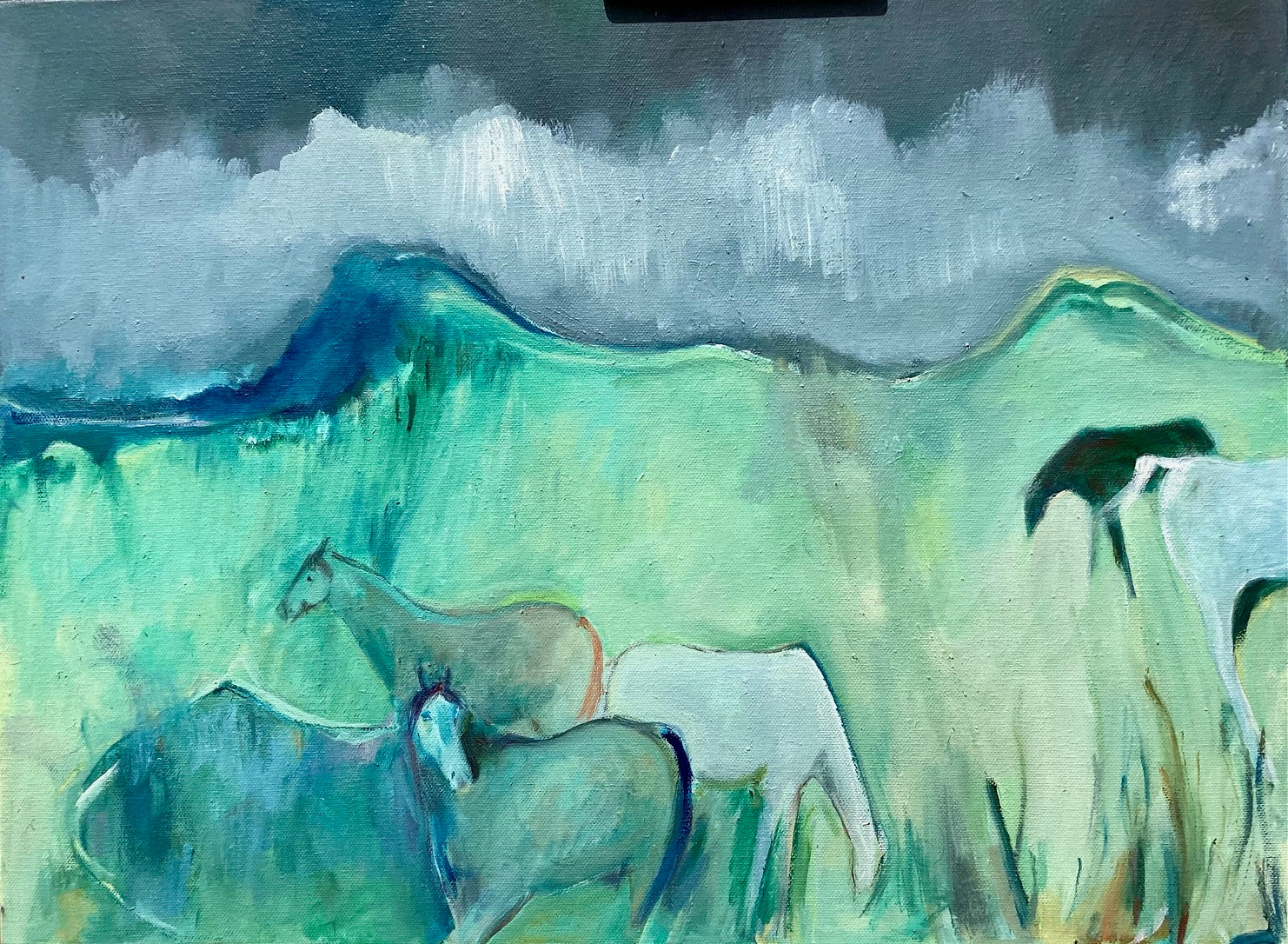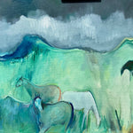 Robbie enjoys a certain freedom as a painter. He is engrossed by landscapes, and not surprisingly, they form the foundation of most of his paintings. Horses in fields grazing, grouped, and resting, provides a sense of humanity within Robbie’s paintings. It allows the viewer to identify with the painting subjects and relate them back to daily human behaviours. These subjects are at ease within rolling pastures and sweeping, distant mountain ranges.
