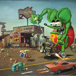 Artist Statement: Rat Fink tests out the new engine on the coupe - Rod Bathgate.