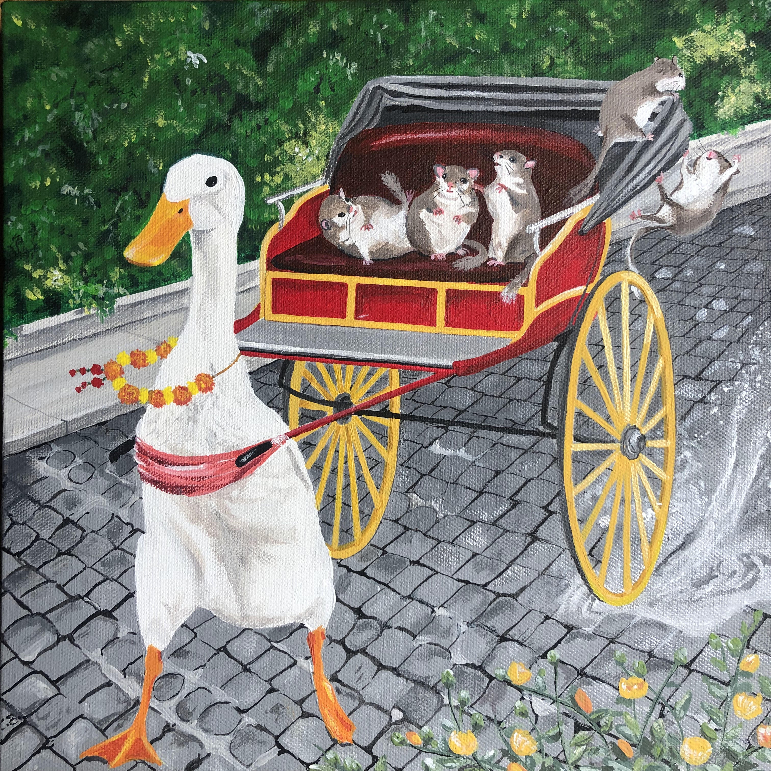 Artist Statement: With a bunch of unruly rodentson board, this indian runner duck may be strongly hoping the trip will end soon. - Catherine Banney