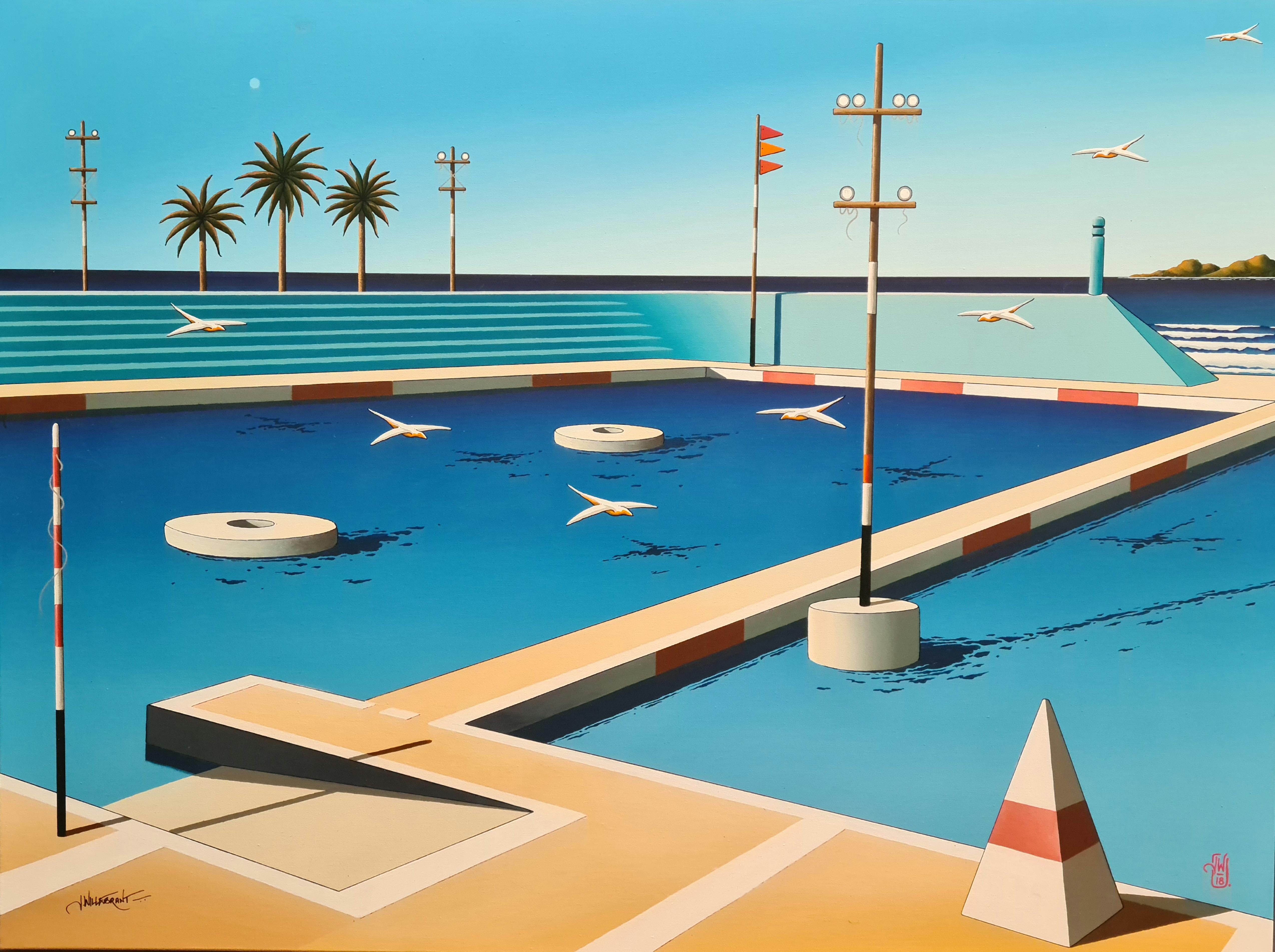Artist Statement: I have painted my interpretation of the City Baths many times over the years. I can always find an interesting angle which includes my favourite stepped pool wall and the bridge that dissects the baths. Some added extras as in the palms lift the composition and makes it mine…..And still “my preferred pool”. - James Willebrant.