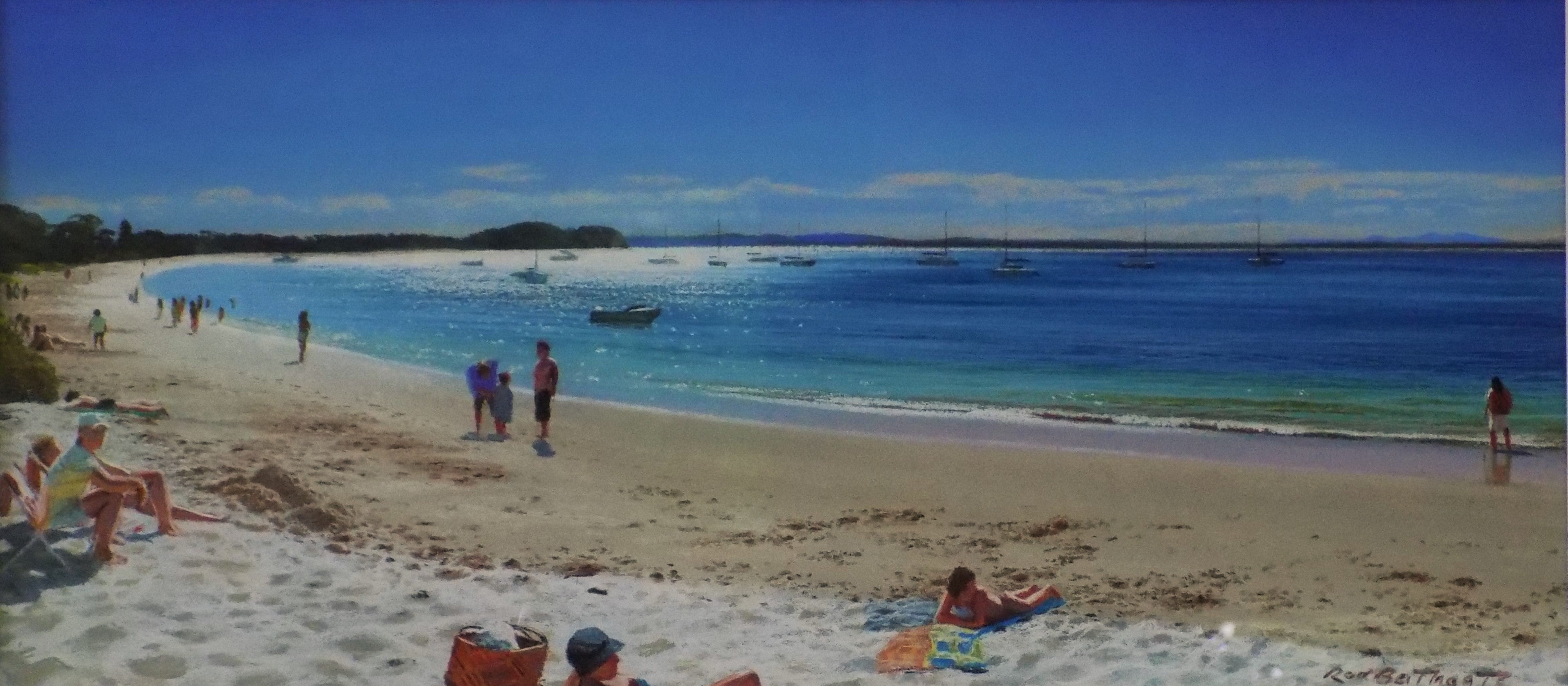 Rod is not only accomplished with pastel on paper and board, but equally so in oil painting. Photo like complicated compositions detailing, light, water effects and beachscapes with a figurative aspect are what we expect from this artist.